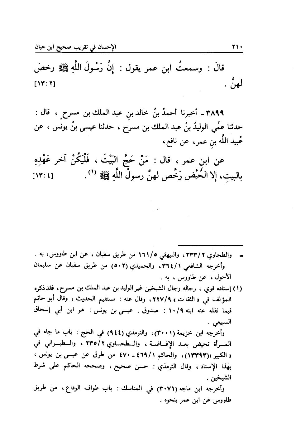 3899 - أَخْبَرَنَا أَحْمَدُ بْنُ خَالِدِ بْنِ عَبْدِ الْمَلِكِ بْنِ مُسَرِّحٍ، قَالَ: حَدَّثَنَا عَمِّي الْوَلِيدُ بْنُ عَبْدِ الْمَلِكِ بْنِ مُسَرِّحٍ، حَدَّثَنَا عِيسَى بْنُ يُونُسَ، عَنْ عُبَيْدِ اللَّهِ بْنِ عُمَرَ، عَنْ نَافِعٍ عَنِ بن عُمَرَ قَالَ: مَنْ حَجِّ الْبَيْتَ، فَلْيَكُنْ آخِرَ عَهْدِهِ بِالْبَيْتِ، إِلَّا الْحُيَّضَ رَخَّصَ لَهُنَّ رَسُولُ الله صلى الله عليه وسلم1. [13:4]