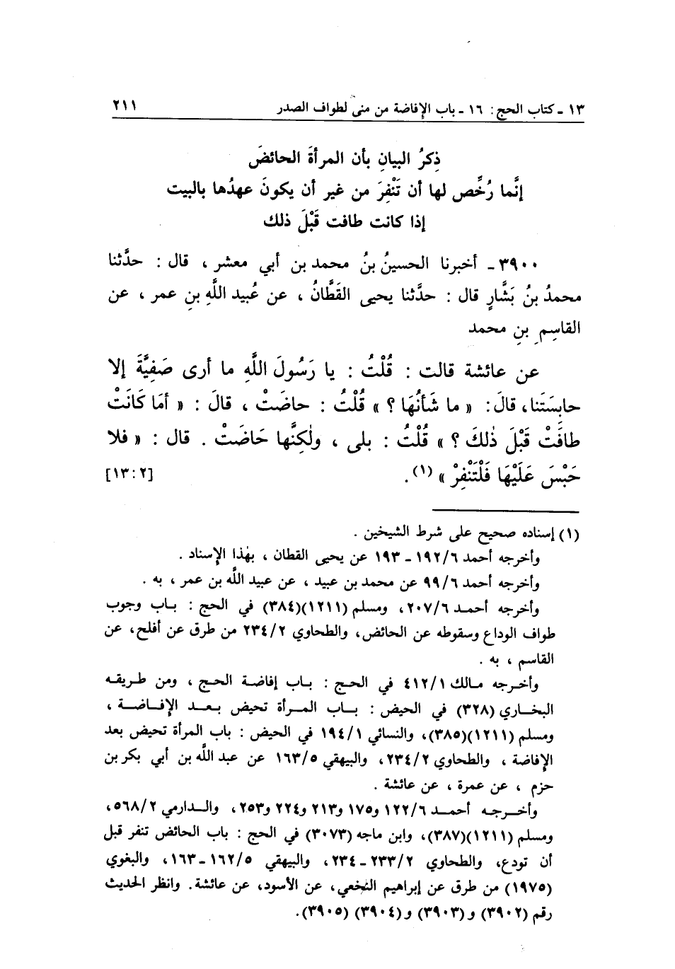 وأخرجه مالك1/412 في الحج: باب إفاضة الحج، ومن طريقه البخاري 328 في الحيض: باب المرأة تحيض بعد الإفاضة، ومسلم 1211 385 والنسائي 1/194 في الحيض: باب المرأة تحيض بعد الإفاضة، والطحاوي 2/234، والبيهقي 5/165 عَنْ عَبْدِ اللَّهِ بْنِ أَبِي بَكْرِ بْنِ حزم، عن عمرة، عن عائشة.