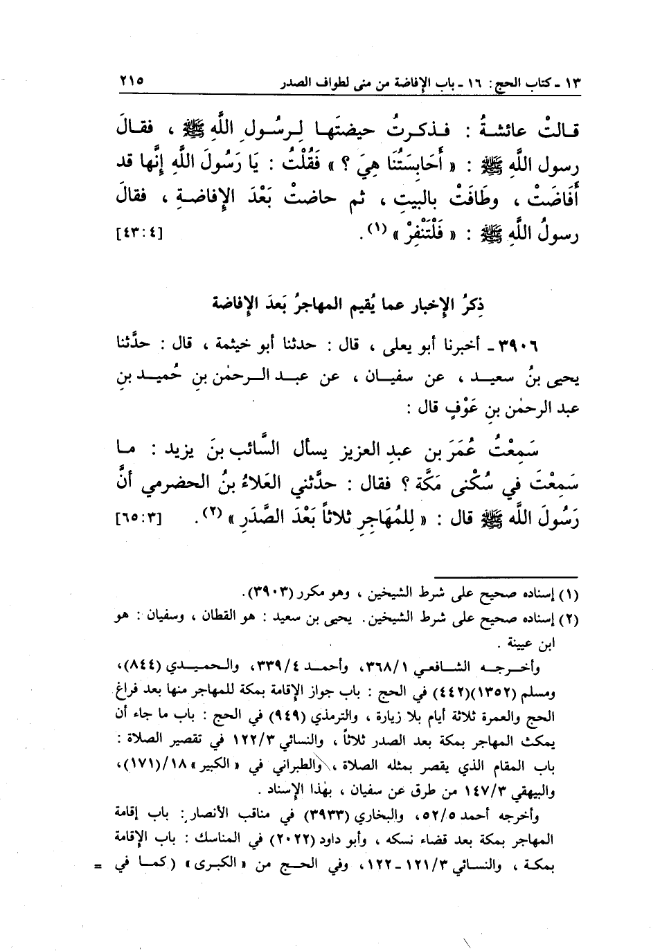 3906 - أَخْبَرَنَا أَبُو يَعْلَى، قَالَ: حَدَّثَنَا أَبُو خَيْثَمَةَ، قَالَ: حَدَّثَنَا يَحْيَى بْنُ سَعِيدٍ، عَنْ سُفْيَانَ، عَنْ عَبْدِ الرَّحْمَنِ بْنِ حُمَيْدِ بْنِ عَبْدِ الرَّحْمَنِ بْنِ عَوْفٍ قَالَ: سَمِعْتُ عُمَرَ بْنَ عَبْدِ الْعَزِيزِ يَسْأَلُ السَّائِبَ بْنَ يَزِيدَ: مَا سَمِعْتَ فِيَ سُكْنَى مَكَّةَ؟ فَقَالَ: حَدَّثَنِي الْعَلَاءُ بْنُ الْحَضْرَمِيِّ أَنَّ رَسُولَ اللَّهِ صَلَّى اللَّهُ عَلَيْهِ وَسَلَّمَ قَالَ: "لِلْمُهَاجِرِ ثَلَاثًا بَعْدَ الصَّدَرِ" 1. [65:3]