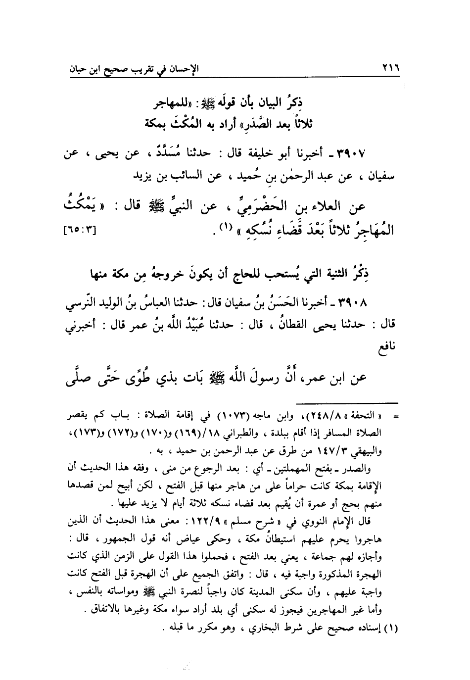 3907 - أَخْبَرَنَا أَبُو خَلِيفَةَ قَالَ: حَدَّثَنَا مُسَدَّدٌ، عَنْ يَحْيَى، عَنْ سُفْيَانَ، عَنْ عَبْدِ الرَّحْمَنِ بْنِ حُمَيْدٍ، عَنِ السَّائِبِ بْنِ يَزِيدَ عَنِ الْعَلَاءِ بْنِ الْحَضْرَمِيِّ، عَنِ النَّبِيِّ صَلَّى اللَّهُ عَلَيْهِ وَسَلَّمَ قَالَ: "يَمْكُثُ الْمُهَاجِرُ ثَلَاثًا بعد قضاء نسكه" 1.