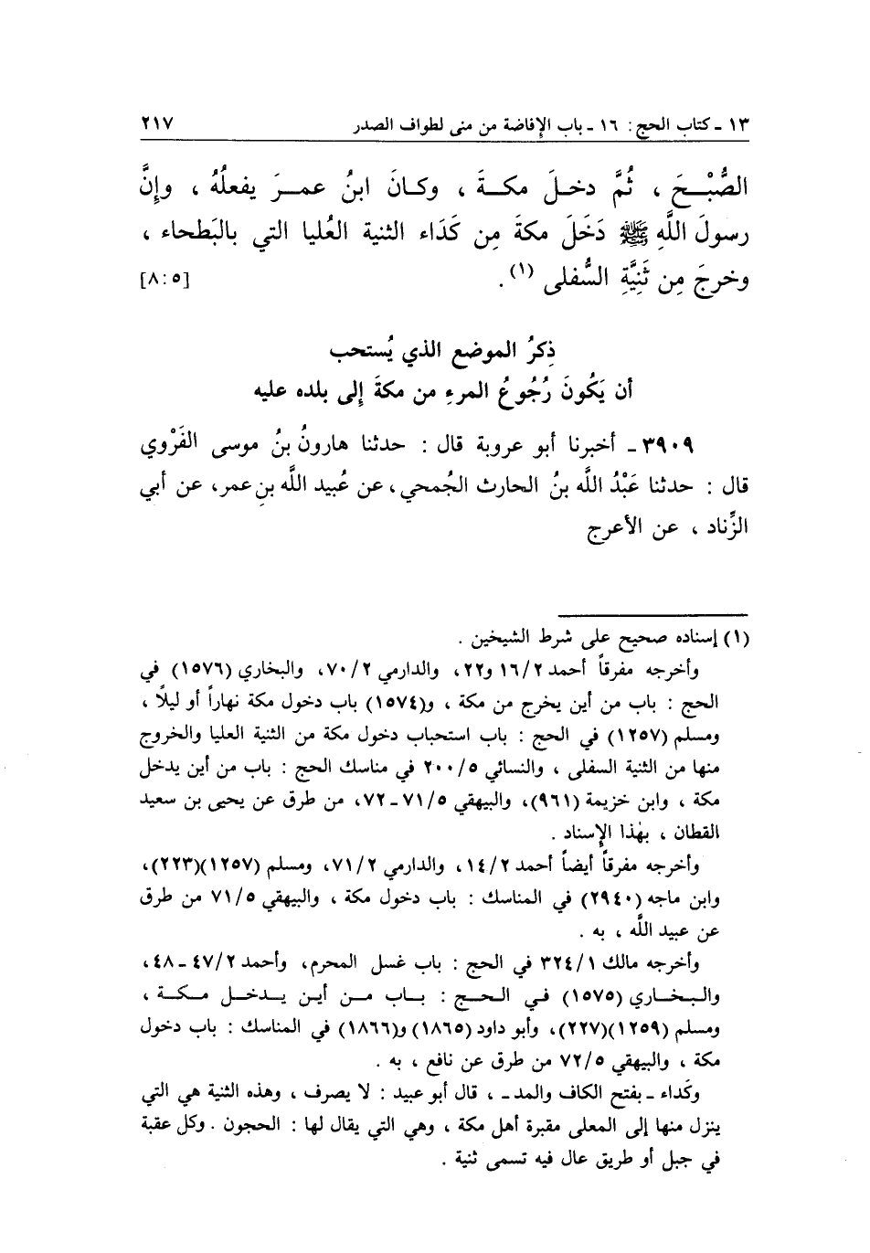 الصُّبْحَ، ثُمَّ دَخَلَ مَكَّةَ، وَكَانَ ابْنُ عُمَرَ يَفْعَلُهُ، وَإِنَّ رَسُولَ اللَّهِ صَلَّى اللَّهُ عَلَيْهِ وَسَلَّمَ دَخَلَ مَكَّةَ مِنْ كَدَاءِ الثَّنِيَّةِ الْعُلْيَا التي بالبطحاء، وخرج من ثنية السفلى 1. [8:5]