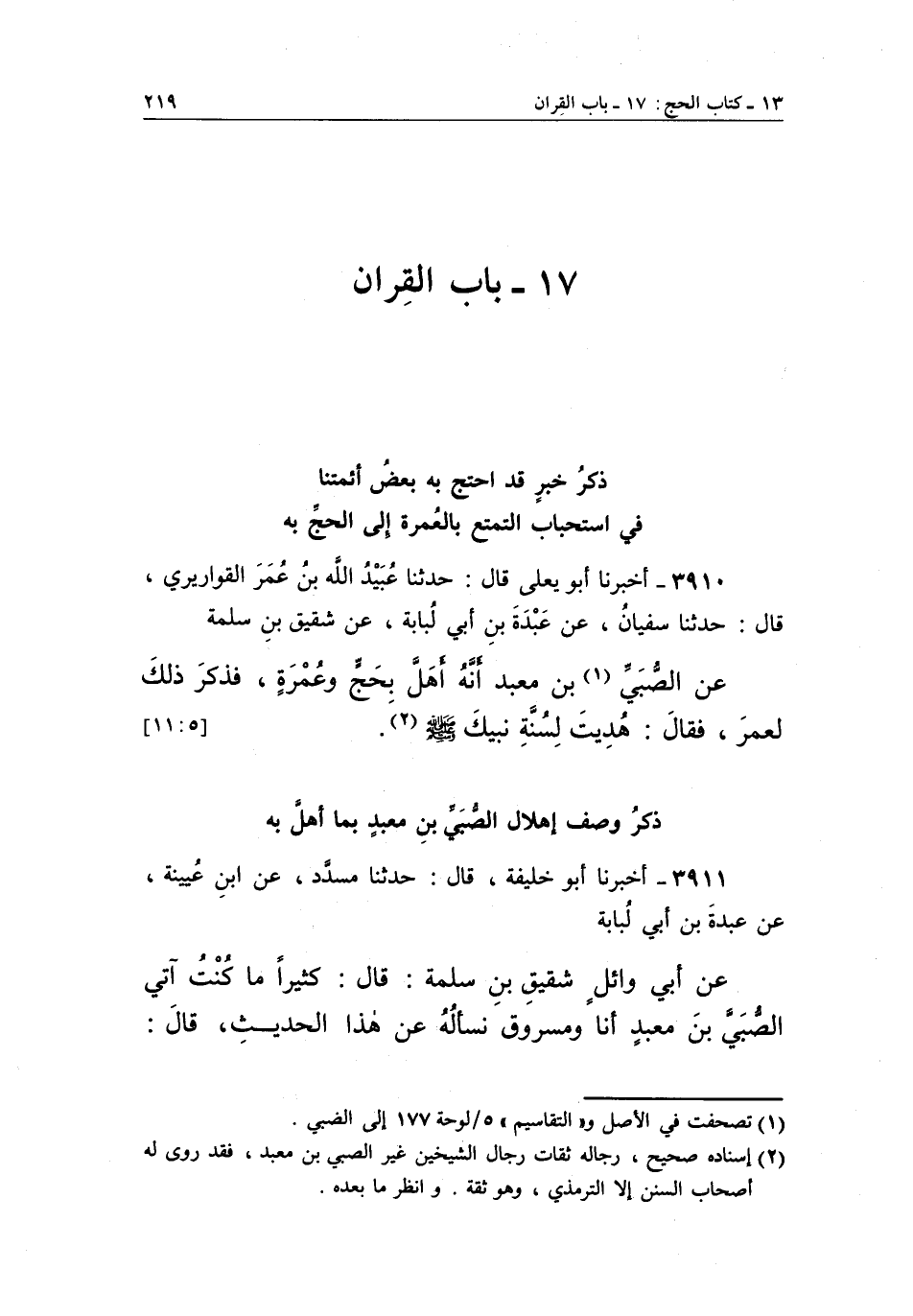 3911 - أَخْبَرَنَا أَبُو خَلِيفَةَ، قَالَ: حَدَّثَنَا مُسَدَّدٌ، عَنْ بن عُيَيْنَةَ، عَنْ عَبْدَةَ بْنِ أَبِي لُبَابَةَ عَنْ أَبِي وَائِلٍ شَقِيقِ بْنِ سَلَمَةَ قَالَ: كَثِيرًا مَا كُنْتُ آتِي الصُّبَيَّ بْنَ مَعْبَدٍ أَنَا ومسروق نسأله عن هذا الحديث، قال: ذِكْرُ وَصْفِ إِهْلَالِ الصُّبَيِّ بْنِ مَعْبَدٍ بِمَا أَهَلَّ بِهِ