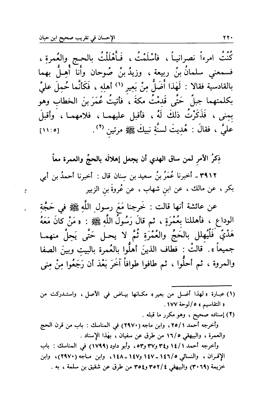كنت امرءا نَصْرَانِيًّا، فَأَسْلَمْتُ، فَأَهْلَلْتُ بِالْحَجِّ وَالْعُمْرَةِ، فَسَمِعَنِي سَلْمَانُ بْنُ رَبِيعَةَ، وَزَيْدُ بْنُ صُوحَانَ وَأَنَا أُهِلُّ بِهِمَا بِالْقَادِسِيَّةِ فَقَالَا: لَهَذَا أَضَلُّ مِنْ بَعِيرِ1 أَهْلِهِ، فَكَأَنَّمَا حُمِلَ عَلَيَّ بِكَلِمَتِهِمَا جَبَلٌ حَتَّى قَدِمْتُ مَكَّةَ، فَأَتَيْتُ عُمَرَ بْنَ الْخَطَّابِ وَهُوَ بِمِنًى، فَذَكَرْتُ ذَلِكَ لَهُ، فَأَقْبَلَ عَلَيْهِمَا، فَلَامَهُمَا، وَأَقْبَلَ عَلَيَّ، فَقَالَ: هُدِيتَ لِسُنَّةِ نَبِيِّكَ صَلَّى الله عليه وسلم مرتين2.