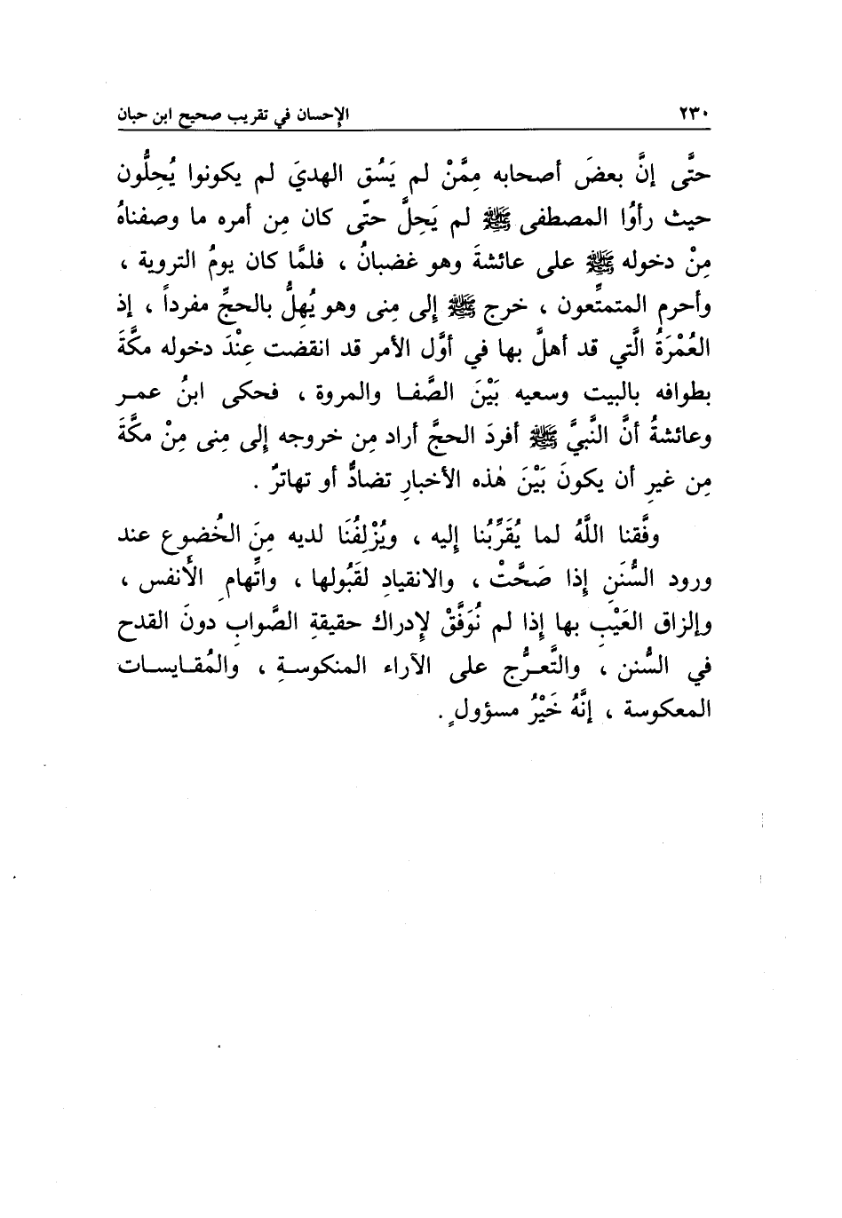 حَتَّى إِنَّ بَعْضَ أَصْحَابِهِ مِمَنْ لَمْ يَسُقِ الْهَدْيَ لَمْ يَكُونُوا يُحِلُّونَ حَيْثُ رَأَوَا الْمُصْطَفَى صَلَّى اللَّهُ عَلَيْهِ وَسَلَّمَ لَمْ يَحِلَّ حَتَّى كَانَ مِنْ أَمْرِهِ مَا وَصَفْنَاهُ مِنْ دُخُولِهِ صَلَّى اللَّهُ عَلَيْهِ وَسَلَّمَ عَلَى عَائِشَةَ وَهُوَ غَضْبَانُ، فَلَمَّا كَانَ يَوْمُ التَّرْوِيَةِ، وَأَحْرَمَ الْمُتَمَتِّعُونَ خَرَجَ صَلَّى اللَّهُ عَلَيْهِ وَسَلَّمَ إِلَى مِنًى وَهُوَ يُهِلُّ بِالْحَجِّ مُفْرَدًا، إِذِ الْعُمْرَةُ الَّتِي قَدْ أَهَلَّ بِهَا فِي أَوَّلِ الْأَمْرِ قَدِ انْقَضَتْ عِنْدَ دُخُولِهِ مَكَّةَ بِطَوَافِهِ بِالْبَيْتِ وَسَعْيِهِ بين الصفا والمروة، فحكى بن عُمَرَ وَعَائِشَةُ أَنَّ النَّبِيَّ صَلَّى اللَّهُ عَلَيْهِ وَسَلَّمَ أَفْرَدَ الْحَجَّ أَرَادَ مِنْ خُرُوجِهِ إِلَى مِنًى مِنْ مَكَّةَ مِنْ غَيْرِ أَنْ يَكُونَ بَيْنَ هَذِهِ الْأَخْبَارِ تَضَادٌ أَوْ تَهَاتُرٌ.