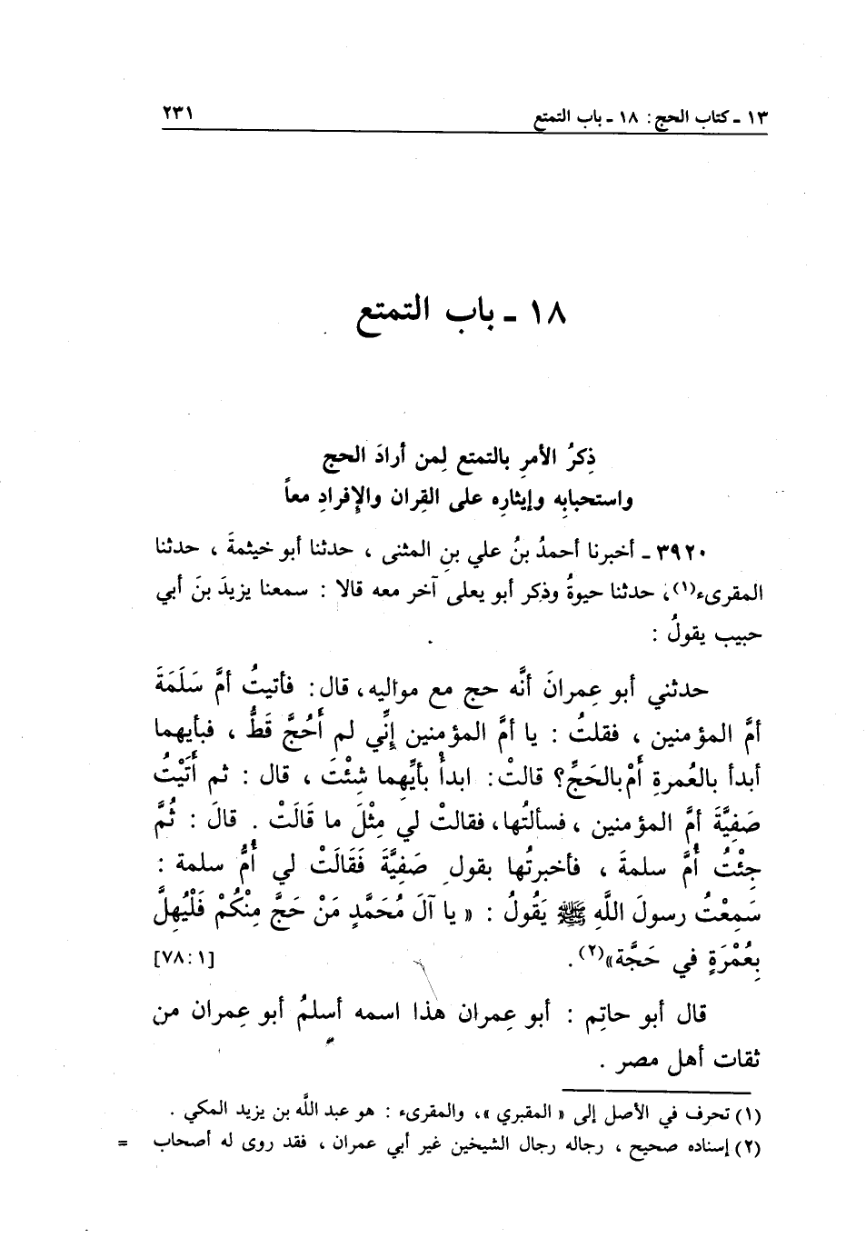 3920 - أَخْبَرَنَا أَحْمَدُ بْنُ عَلِيِّ بْنِ الْمُثَنَّى، حَدَّثَنَا أَبُو خَيْثَمَةَ، حَدَّثَنَا الْمُقْرِئُ1، حَدَّثَنَا حَيْوَةُ وَذَكَرَ أَبُو يَعْلَى آخَرَ مَعَهُ قَالَا: سَمِعْنَا يَزِيدَ بْنَ أَبِي حَبِيبٍ يَقُولُ: حَدَّثَنِي أَبُو عِمْرَانَ أَنَّهُ حَجَّ مَعَ مَوَالِيهِ، قَالَ: فَأَتَيْتُ أُمَّ سَلَمَةَ أُمَّ الْمُؤْمِنِينَ، فَقُلْتُ: يَا أُمَّ الْمُؤْمِنِينَ إِنِّي لَمْ أَحُجَّ قَطُّ، فَبِأَيِّهِمَا أَبْدَأُ بِالْعُمْرَةِ أَمْ بِالْحَجِّ؟ قَالَتِ: ابْدَأْ بِأَيِّهِمَا شِئْتَ، قَالَ: ثُمَّ أَتَيْتُ صَفِيَّةَ أُمَّ الْمُؤْمِنِينَ، فَسَأَلْتُهَا، فَقَالَتْ لِي مِثْلَ مَا قَالَتْ، قَالَ: ثُمَّ جِئْتُ أُمَّ سَلَمَةَ، فَأَخْبَرْتُهَا بِقَوْلِ صَفِيَّةَ، فَقَالَتْ لِي أُمُّ سَلَمَةَ: سَمِعْتُ رَسُولَ اللَّهِ صَلَّى اللَّهُ عَلَيْهِ وَسَلَّمَ يَقُولُ: "يَا آلَ مُحَمَّدٍ مَنْ حَجِّ مِنْكُمْ فَلْيُهِلَّ بِعُمْرَةٍ فِي حَجَّةٍ" 2. [78:1]