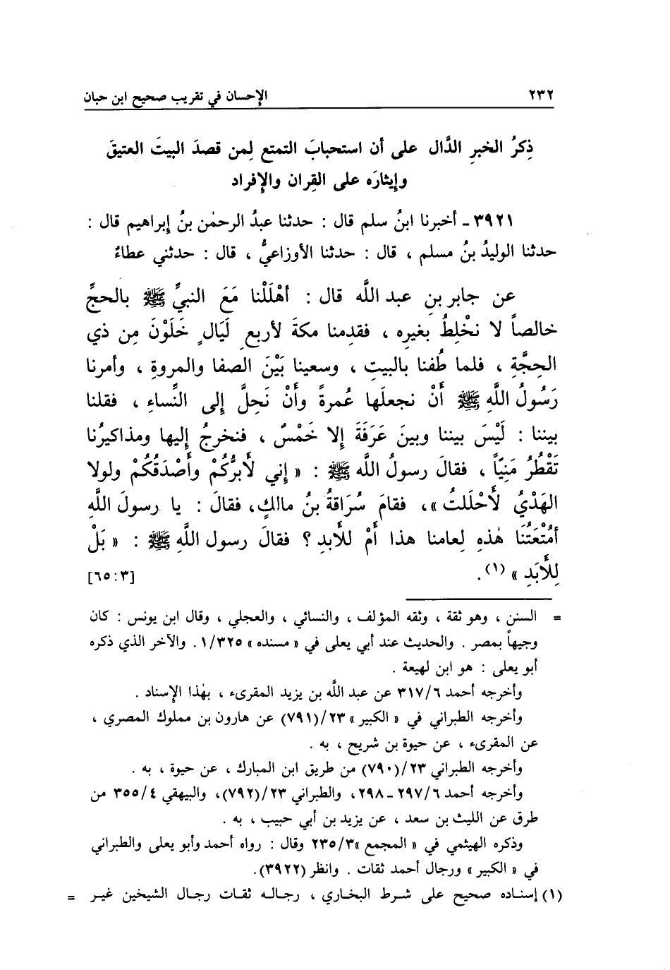 3921 - أخبرنا بْنِ سَلْمٍ قَالَ: حَدَّثَنَا عَبْدُ الرَّحْمَنِ بْنُ إِبْرَاهِيمَ قَالَ: حَدَّثَنَا الْوَلِيدُ بْنُ مُسْلِمٍ، قَالَ: حَدَّثَنَا الْأَوْزَاعِيُّ، قَالَ: حَدَّثَنِي عَطَاءٌ عَنْ جَابِرِ بْنِ عَبْدِ اللَّهِ قَالَ: أَهْلَلْنَا مَعَ النَّبِيِّ صَلَّى اللَّهُ عَلَيْهِ وَسَلَّمَ بِالْحَجِّ خَالِصًا لَا نخلط بغيره، فقدمنا مكة لأربع ليالي خَلَوْنَ مِنْ ذِي الْحِجَّةِ، فَلَمَّا طُفْنَا بِالْبَيْتِ، وَسَعَيْنَا بَيْنَ الصَّفَا وَالْمَرْوَةِ، وَأَمَرَنَا رَسُولُ اللَّهِ صَلَّى اللَّهُ عَلَيْهِ وَسَلَّمَ أَنْ نَجْعَلَهَا عَمْرَةً وَأَنْ نَحِلَّ إِلَى النِّسَاءِ، فَقُلْنَا بَيْنَنَا: لَيْسَ بَيْنَنَا وَبَيْنَ عَرَفَةَ إِلَّا خَمْسٌ، فَنَخْرُجُ إِلَيْهَا وَمَذَاكِيرُنَا تَقْطُرُ مَنِيًّا، فَقَالَ رَسُولُ اللَّهِ صَلَّى اللَّهُ عَلَيْهِ وَسَلَّمَ: "إِنِّي لَأَبَرُّكُمْ وَأَصْدَقُكُمْ وَلَوْلَا الْهَدْيُ لَأَحْلَلْتُ". فَقَامَ سُرَاقَةُ بْنُ مَالِكٍ فَقَالَ: يَا رَسُولَ اللَّهِ أَمْتِعَتُنَا هَذِهِ لِعَامِنَا هَذَا أَمْ لِلْأَبَدِ؟. فَقَالَ رَسُولُ اللَّهِ صَلَّى اللَّهُ عَلَيْهِ وَسَلَّمَ: "بل للأبد" 1. [65:3]