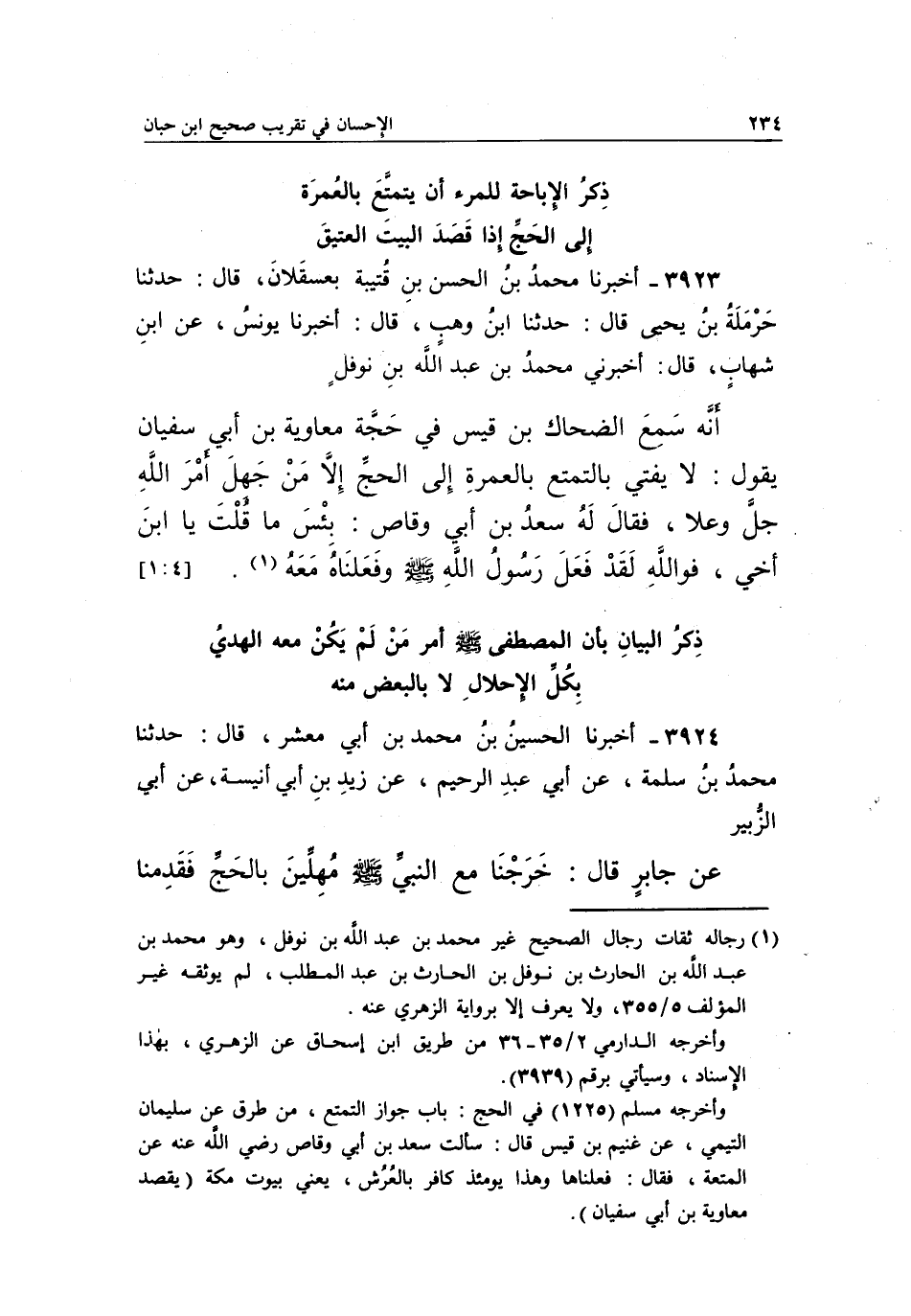 3923 - أَخْبَرَنَا مُحَمَّدُ بْنُ الْحَسَنِ بْنِ قُتَيْبَةَ بِعَسْقَلَانَ، قَالَ: حَدَّثَنَا حَرْمَلَةُ بْنُ يَحْيَى، قَالَ: حَدَّثَنَا بن وَهْبٍ، قَالَ: أَخْبَرَنَا يُونُسُ، عَنِ ابْنِ شِهَابٍ، قَالَ: أَخْبَرَنِي مُحَمَّدُ بْنُ عَبْدِ اللَّهِ بْنِ نَوْفَلٍ أَنَّهُ سَمِعَ الضَّحَّاكَ بْنَ قَيْسٍ فِي حَجَّةِ مُعَاوِيَةَ بْنِ أَبِي سُفْيَانَ يَقُولُ: لَا يَفْتِي بِالتَّمَتُّعِ بِالْعُمْرَةِ إِلَى الْحَجِّ إِلَّا مَنْ جَهِلَ أَمْرَ اللَّهِ جَلَّ وَعَلَا، فَقَالَ لَهُ سعد بن أبي وقاص: بئس ما قلت يا بن أَخِي، فَوَاللَّهِ لَقَدْ فَعَلَ رَسُولُ اللَّهِ صَلَّى اللَّهُ عَلَيْهِ وَسَلَّمَ وفعلناه معه 1. [1:4]