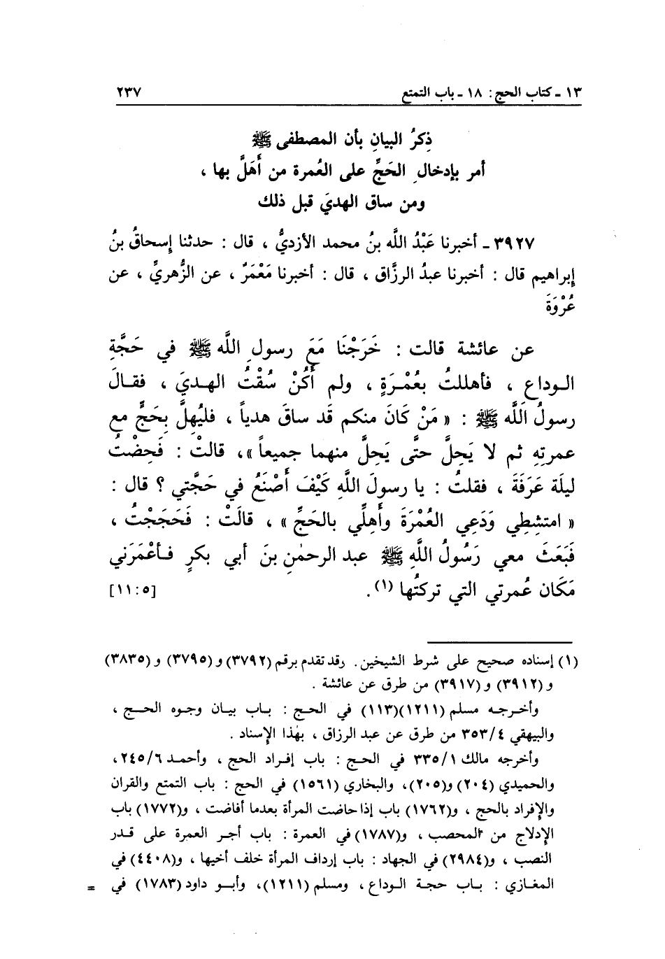 3927 - أَخْبَرَنَا عَبْدُ اللَّهِ بْنُ مُحَمَّدٍ الْأَزْدِيُّ، قَالَ: حَدَّثَنَا إِسْحَاقُ بْنُ إِبْرَاهِيمَ قَالَ: أَخْبَرَنَا عَبْدُ الرَّزَّاقِ، قَالَ: أَخْبَرَنَا مَعْمَرٌ، عَنِ الزُّهْرِيِّ، عَنْ عُرْوَةَ عَنْ عَائِشَةَ قَالَتْ: خَرَجْنَا مَعَ رَسُولِ اللَّهِ صَلَّى اللَّهُ عَلَيْهِ وَسَلَّمَ فِي حَجَّةِ الْوَدَاعِ، فَأَهْلَلْتُ بِعُمْرَةٍ، وَلَمْ أَكُنْ سُقْتُ الْهَدْيَ، فَقَالَ رَسُولُ اللَّهِ صَلَّى اللَّهُ عَلَيْهِ وَسَلَّمَ: "مَنْ كَانَ مِنْكُمْ قَدْ سَاقَ هَدْيًا، فَلْيُهِلَّ بِحَجٍّ مَعَ عُمْرَتِهِ ثُمَّ لَا يَحِلَّ حَتَّى يَحِلَّ مِنْهُمَا جَمِيعًا". قَالَتْ: فَحِضْتُ لَيْلَةَ عَرَفَةَ، فَقُلْتُ: يَا رَسُولَ اللَّهِ كَيْفَ أَصْنَعُ فِي حَجَّتِي؟ قَالَ: "امْتَشِطِي وَدَعِي الْعُمْرَةَ وَأَهِلِّي بِالْحَجِّ". قَالَتْ: فَحَجَجْتُ، فَبَعَثَ مَعِي رَسُولُ اللَّهِ صَلَّى اللَّهُ عَلَيْهِ وَسَلَّمَ عَبْدُ الرَّحْمَنِ بْنُ أَبِي بكر فأعمرني مكان عمرتي التي تركتها1. [11:5]