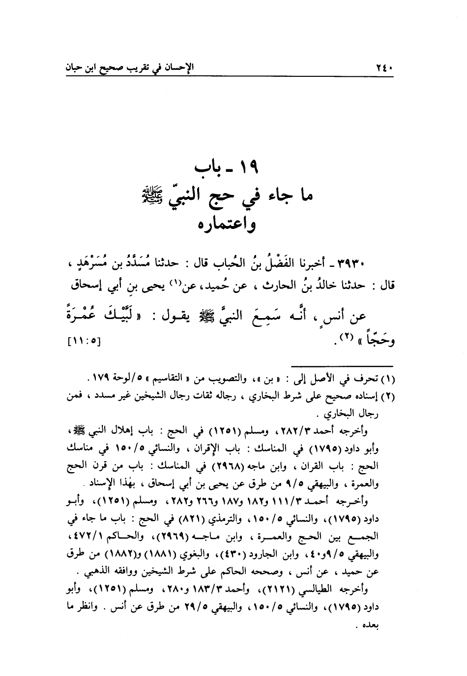 3930 - أَخْبَرَنَا الْفَضْلُ بْنُ الْحُبَابِ قَالَ: حَدَّثَنَا مُسَدَّدُ بْنُ مُسَرْهَدٍ، قَالَ: حَدَّثَنَا خَالِدُ بْنُ الْحَارِثِ، عَنْ حُمَيْدٍ، عَنْ1 يَحْيَى بْنِ أَبِي إِسْحَاقَ عَنْ أَنَسِ، أَنَّهُ سمع النبي يقول: "لبيك عمرة وحجا" 2. [11:5]