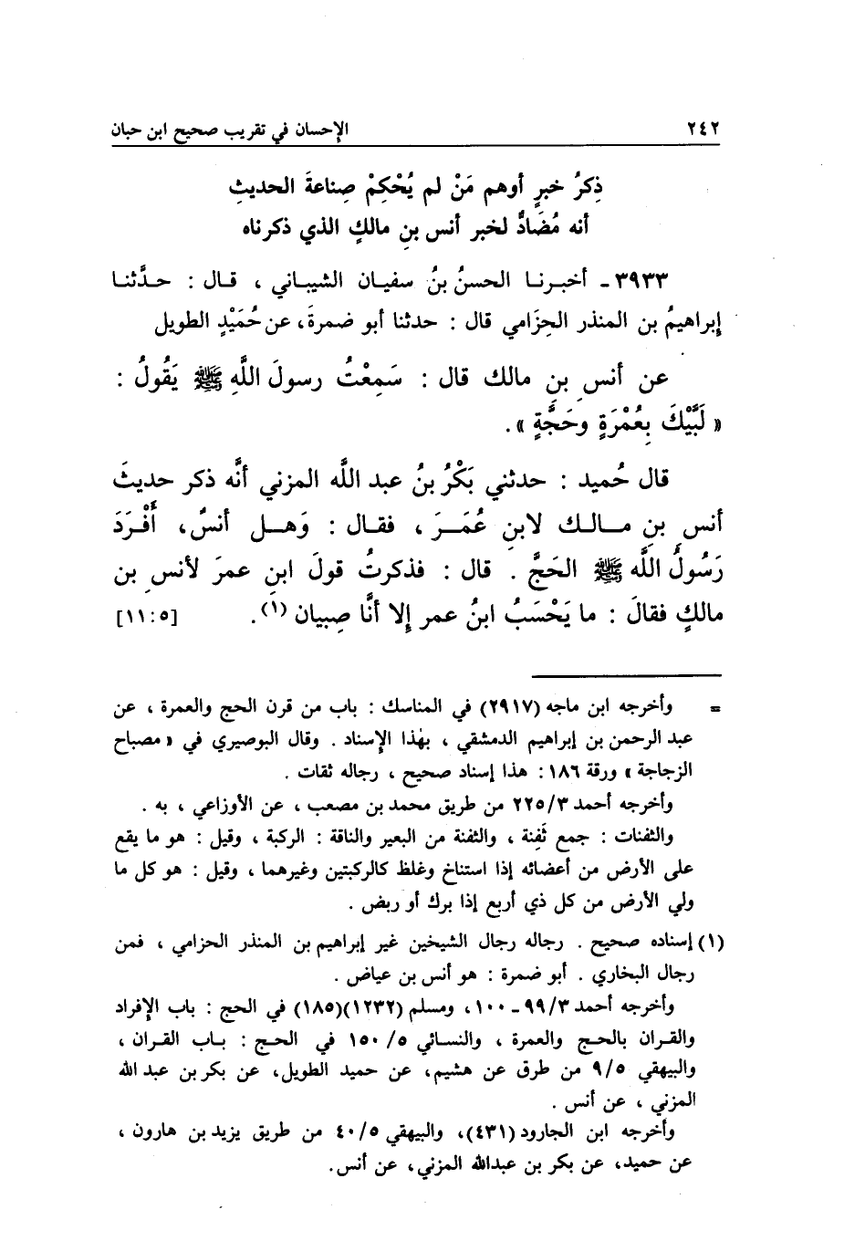 3933 - أَخْبَرَنَا الْحَسَنُ بْنُ سُفْيَانَ الشَّيْبَانِيُّ، قَالَ: حَدَّثَنَا إِبْرَاهِيمُ بْنُ الْمُنْذِرِ الْحِزَامِيُّ، قَالَ: حَدَّثَنَا أَبُو ضَمْرَةَ، عَنْ حُمَيْدٌ الطَّوِيلُ عَنْ أَنَسِ بْنِ مَالِكٍ قَالَ: سَمِعْتُ رَسُولَ اللَّهِ صَلَّى اللَّهُ عَلَيْهِ وَسَلَّمَ يَقُولُ: "لَبَّيْكَ بِعُمْرَةٍ وَحَجَّةٍ".