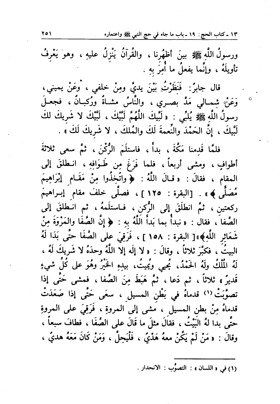 قَالَ جَابِرٌ: فَنَظَرْتُ بَيْنِ يَدَيَّ وَمِنْ خَلْفِي، وَعَنْ يَمِينِي، وَعَنْ شِمَالِي مَدَّ بَصَرِي، وَالنَّاسُ مُشَاةٌ وَرُكْبَانٌ، فَجَعَلَ رَسُولُ اللَّهِ صَلَّى اللَّهُ عَلَيْهِ وَسَلَّمَ يُلَبِّي: "لَبَّيْكَ اللَّهُمَّ لَبَّيْكَ، لَبَّيْكَ لَا شَرِيكَ لَكَ لَبَّيْكَ، إِنَّ الْحَمْدَ وَالنِّعْمَةَ لَكَ وَالْمُلْكَ، لَا شَرِيكَ لَكَ".