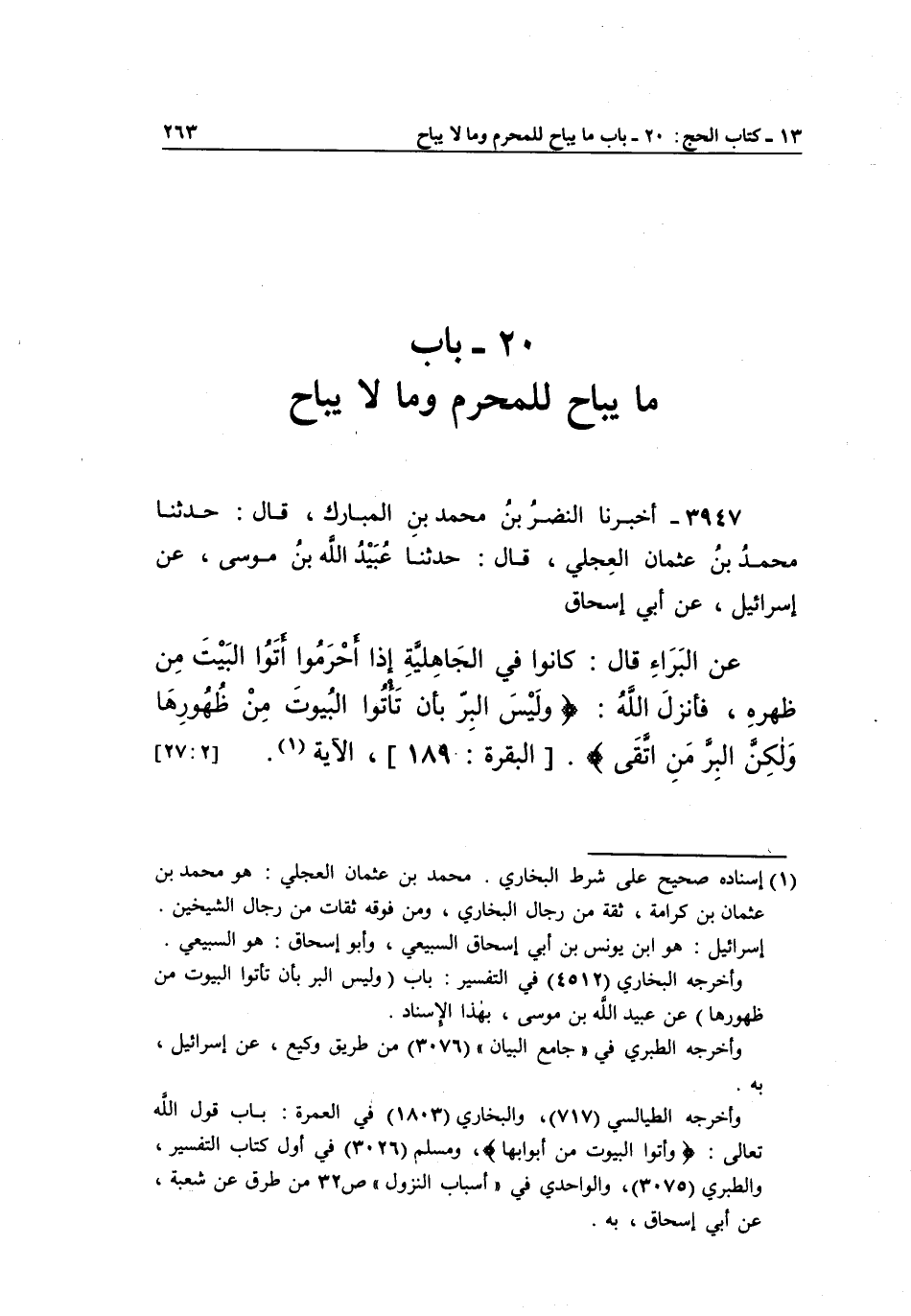 3947 - أَخْبَرَنَا النَّضْرُ بْنُ مُحَمَّدِ بْنِ الْمُبَارَكِ، قَالَ: حَدَّثَنَا مُحَمَّدُ بْنُ عُثْمَانَ الْعِجْلِيُّ، قَالَ: حَدَّثَنَا عُبَيْدُ اللَّهِ بْنُ مُوسَى، عَنْ إِسْرَائِيلَ، عَنْ أَبِي إِسْحَاقَ عَنِ الْبَرَاءِ قَالَ: كَانُوا فِي الْجَاهِلِيَّةِ إِذَا أَحْرَمُوا أَتَوْا الْبَيْتَ مِنْ ظَهْرِهِ، فَأَنْزَلَ اللَّهُ: {وَلَيْسَ الْبِرُّ بِأَنْ تَأْتُوا الْبُيُوتَ مِنْ ظُهُورِهَا وَلَكِنَّ الْبِرَّ مَنِ اتَّقَى} [البقرة: 189] ، الآية1. [27:2]