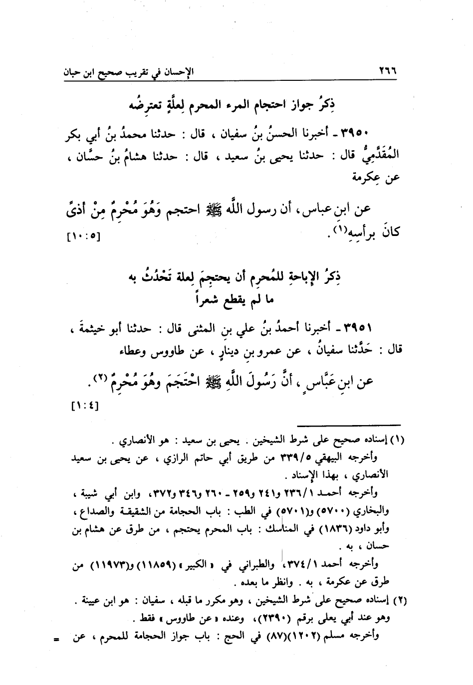3951 - أَخْبَرَنَا أَحْمَدُ بْنُ عَلِيِّ بْنِ الْمُثَنَّى قَالَ: حَدَّثَنَا أَبُو خَيْثَمَةَ، قَالَ: حَدَّثَنَا سُفْيَانُ، عَنْ عَمْرِو بْنِ دِينَارٍ، عَنْ طَاوُسٍ وَعَطَاءٍ عَنِ ابْنِ عَبَّاسٍ، أَنَّ رَسُولَ اللَّهِ صَلَّى الله عليه وسلم احتجم وهو محرم1. [1:4]
