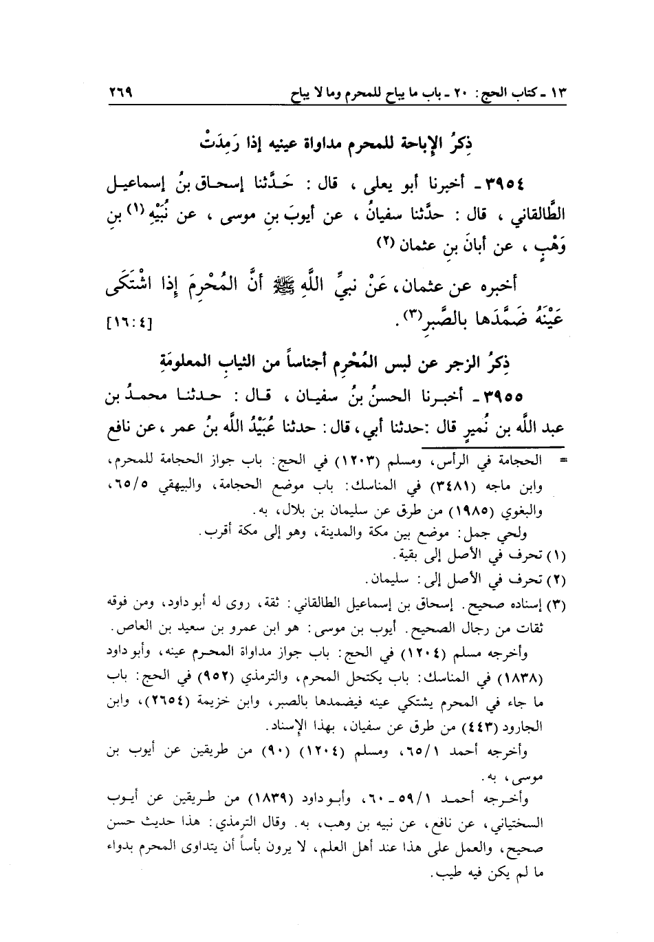 3954 - أَخْبَرَنَا أَبُو يَعْلَى، قَالَ: حَدَّثَنَا إِسْحَاقُ بْنُ إِسْمَاعِيلَ الطَّالَقَانِيُّ، قَالَ: حَدَّثَنَا سُفْيَانُ، عَنْ أَيُّوبَ بْنِ مُوسَى، عَنْ نُبَيْهِ1 بْنِ وَهْبٍ، عَنْ أَبَانَ بْنِ عُثْمَانَ2 أَخْبَرَهُ عَنْ عُثْمَانَ، عَنْ نَبِيِّ اللَّهِ صَلَّى اللَّهُ عَلَيْهِ وَسَلَّمَ أَنَّ المحرم إذا اشتكى عينه ضمدها بالصبر3. [16:4]