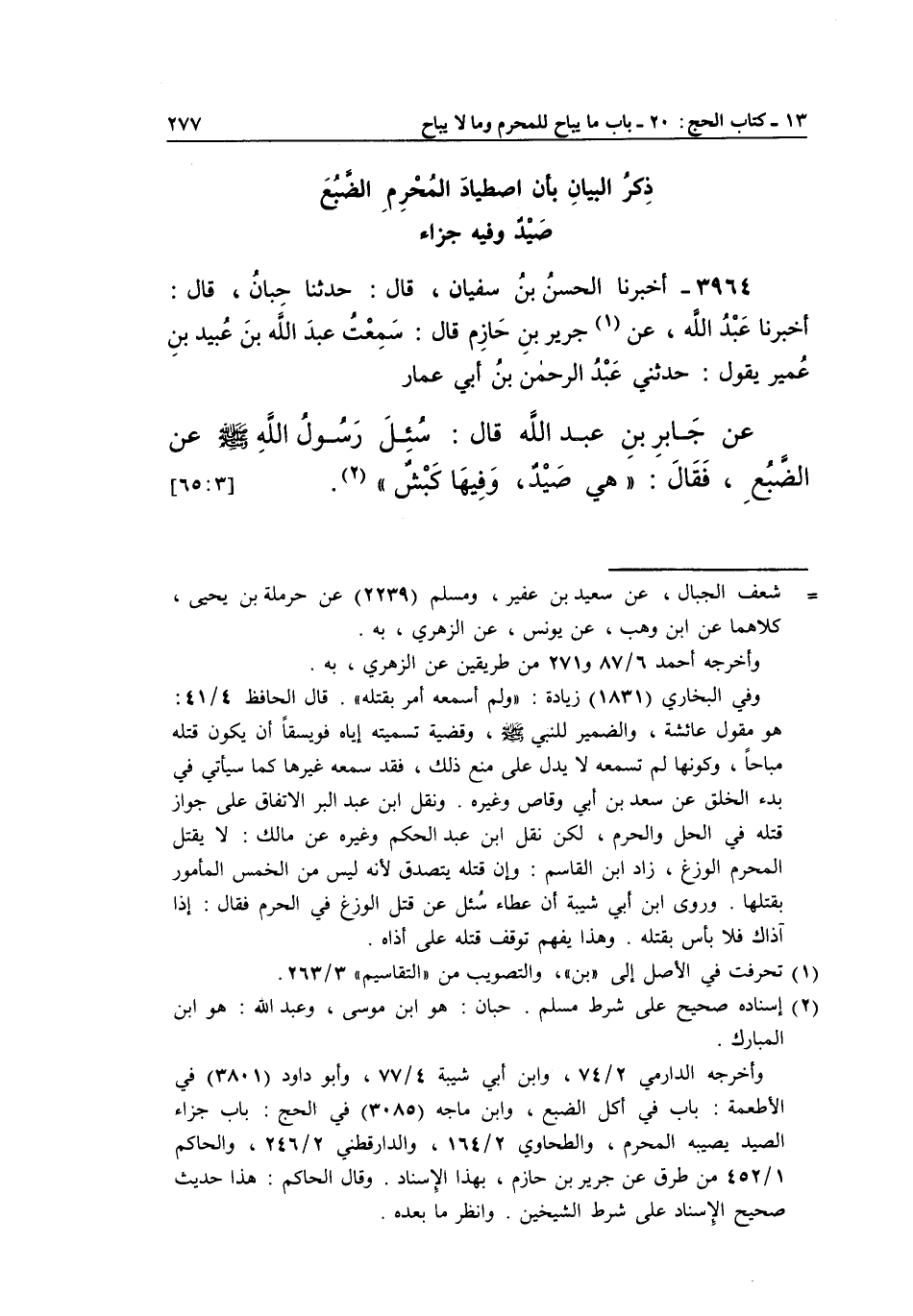 عَنْ جَابِرِ بْنِ عَبْدِ اللَّهِ قَالَ: سُئِلَ رَسُولُ اللَّهِ صَلَّى اللَّهُ عَلَيْهِ وَسَلَّمَ عَنِ الضَّبُعِ، فَقَالَ: "هِيَ صيد، وفيها كبش" 2. [65:3]