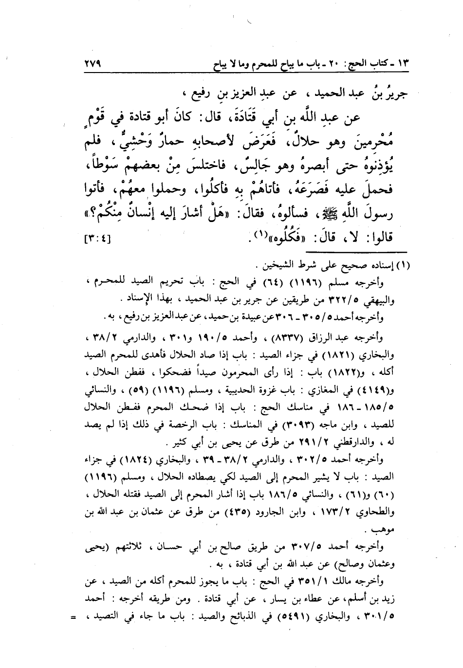 وأخرجه عبد الرزاق 8337، وأحمد 5/190، و 301، والدارمي 2/38، والبخاري 1821، في جزاء الصيد: باب إذا صاد الحلال فأهدى للمحرم أكله، و 1822، باب إذا رأى المحرمون صيداً فضحكوا ففطن الحلال، و 4149، في المغازي: باب غزوة الحديبية، ومسلم 1196، 59، والنسائي 5/185-186، في مناسك الحج: باب إذا ضحك المحرم ففطن الحلال للصيد، وابن ماجه 3093 في المناسك: باب الرخصة في ذلك إذا لم يصد له، والدارقطني2/291 من طرق عن يحيى بن أبي كثير.