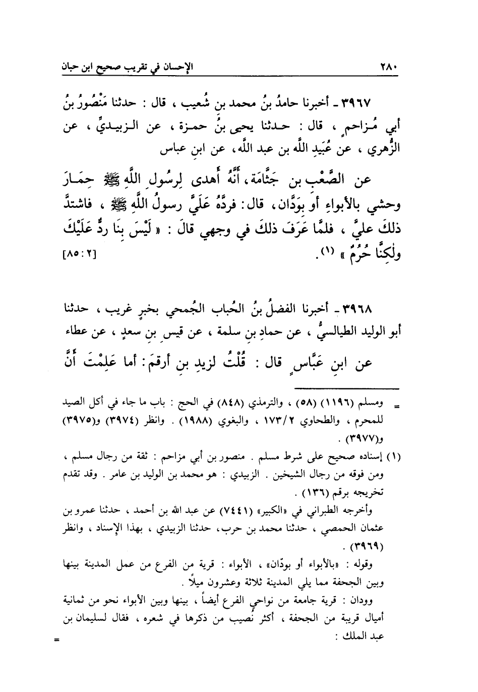 3967 - أَخْبَرَنَا حَامِدُ بْنُ مُحَمَّدِ بْنِ شُعَيْبٍ، قَالَ: حَدَّثَنَا مَنْصُورُ بْنُ أَبِي مُزَاحِمٍ، قَالَ: حَدَّثَنَا يَحْيَى بْنُ حَمْزَةَ، عَنِ الزُّبَيْدِيِّ، عَنِ الزُّهْرِيِّ، عَنْ عُبَيْدِ اللَّهِ بْنِ عَبْدِ اللَّهِ، عَنِ ابْنِ عَبَّاسٍ عَنِ الصَّعْبِ بْنِ جَثَّامَةَ، أَنَّهُ أَهْدَى لِرَسُولِ اللَّهِ صَلَّى اللَّهُ عَلَيْهِ وَسَلَّمَ حِمَارَ وَحْشِيٍّ بِالْأَبْوَاءِ أَوْ بِوَدَّانَ، قَالَ: فَرَدَّهُ عَلَى رَسُولِ اللَّهِ صَلَّى اللَّهُ عَلَيْهِ وَسَلَّمَ، فَاشْتَدَّ ذَلِكَ عَلَيَّ، فَلَمَّا عَرَفَ ذَلِكَ فِي وَجْهِي قَالَ: "لَيْسَ بِنَا رَدٌّ عَلَيْكَ وَلَكِنَّا حرم" 1. [85:2]