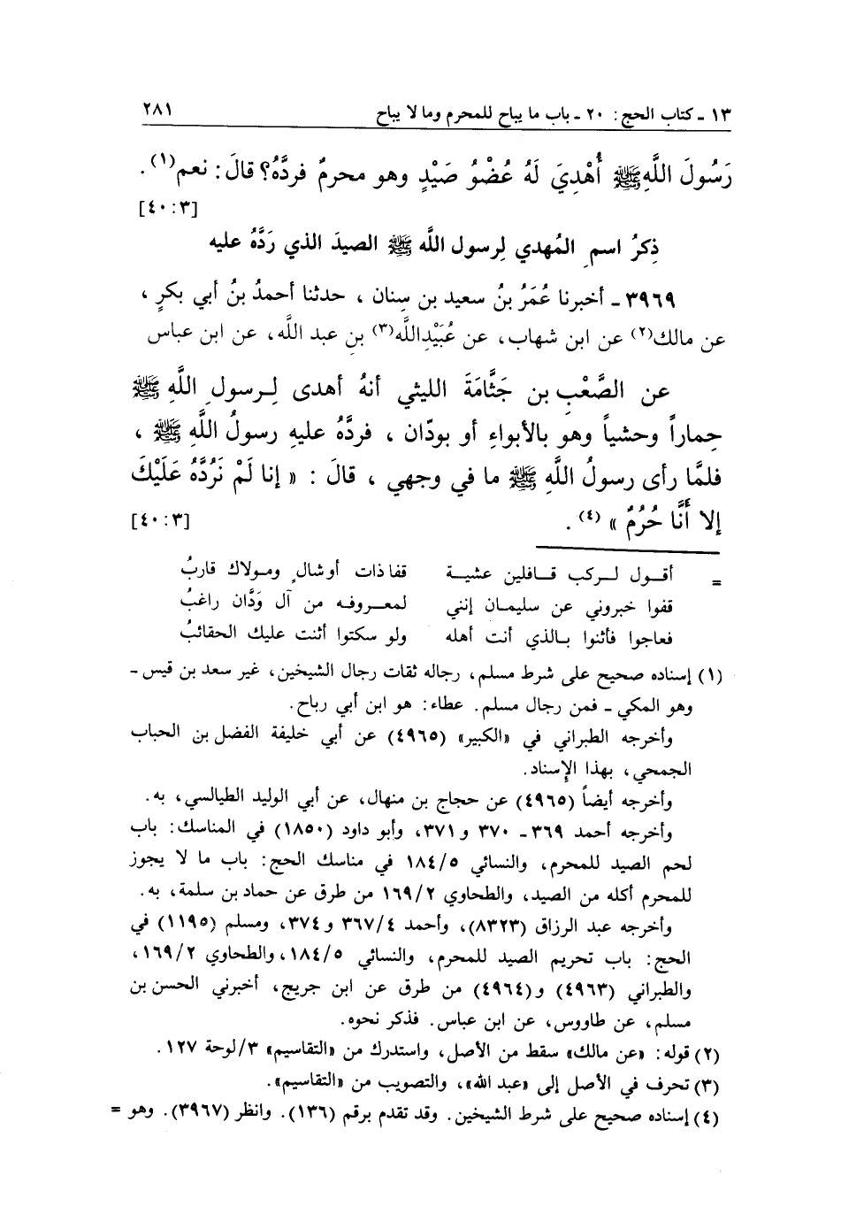 3969 - أَخْبَرَنَا عُمَرُ بْنُ سَعِيدِ بْنِ سِنَانٍ، حَدَّثَنَا أَحْمَدُ بْنُ أَبِي بَكْرٍ، عَنْ مَالِكٍ1، عَنْ بن شِهَابٍ، عَنْ عُبَيْدِ اللَّهِ2 بْنِ عَبْدِ اللَّهِ، عَنِ بن عَبَّاسٍ عَنِ الصَّعْبِ بْنِ جَثَّامَةَ اللَّيْثِيِّ أَنَّهُ أَهْدَى لِرَسُولِ اللَّهِ صَلَّى اللَّهُ عَلَيْهِ وَسَلَّمَ حِمَارًا وَحْشِيًّا وَهُوَ بِالْأَبْوَاءِ أَوْ بِوَدَّانَ، فَرَدَّهُ عَلَيْهِ رَسُولُ اللَّهِ صَلَّى اللَّهُ عَلَيْهِ وَسَلَّمَ، فَلَمَّا رَأَى رَسُولُ اللَّهِ صَلَّى اللَّهُ عَلَيْهِ وَسَلَّمَ مَا فِي وَجْهِي، قَالَ: "إِنَّا لَمْ نَرُدَّهُ عَلَيْكَ إِلَّا أَنَّا حُرُمٌ" 3. [40:3]