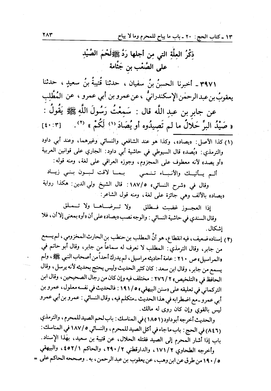 3971 - أَخْبَرَنَا الْحَسَنُ بْنُ سُفْيَانَ، حَدَّثَنَا قُتَيْبَةُ بْنُ سَعِيدٍ، حَدَّثَنَا يَعْقُوبُ بْنُ عَبْدِ الرَّحْمَنِ الْإِسْكَنْدَرَانِيُّ، عَنْ عَمْرِو بْنِ أَبِي عَمْرٍو، عَنِ الْمُطَّلِبِ عَنْ جَابِرِ بْنِ عَبْدِ اللَّهِ قَالَ: سَمِعْتُ رَسُولَ اللَّهِ صَلَّى اللَّهُ عَلَيْهِ وَسَلَّمَ يَقُولُ: "صَيْدُ الْبِرِّ حَلَالٌ مَا لَمْ تصيدوه1 أو يصاد لكم" 2. [40:3]