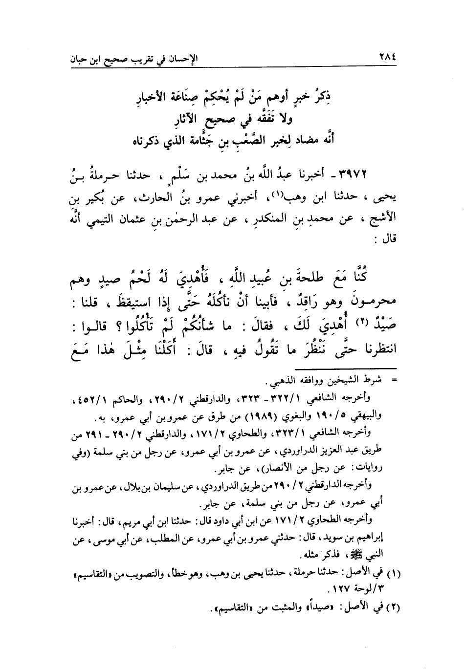 3972 - أَخْبَرَنَا عَبْدُ اللَّهِ بْنُ مُحَمَّدِ بْنِ سَلْمٍ، حَدَّثَنَا حَرْمَلَةُ بْنُ يَحْيَى، حَدَّثَنَا بن وَهْبٍ1، أَخْبَرَنِي عَمْرُو بْنُ الْحَارِثِ، عَنْ بُكَيْرِ بْنِ الْأَشَجِ، عَنْ مُحَمَّدِ بْنِ الْمُنْكَدِرِ، عَنْ عَبْدِ الرَّحْمَنِ بْنِ عُثْمَانَ التَّيْمِيِّ أَنَّهُ قَالَ: كُنَّا مَعَ طَلْحَةَ بْنِ عُبَيْدِ اللَّهِ، فَأُهْدِيَ لَهُ لَحْمُ صَيْدٍ وَهُمْ مُحْرِمُونَ وَهُوَ رَاقِدٌ، فَأَبَيْنَا أَنْ نَأْكُلَهُ حَتَّى إِذَا اسْتَيْقَظَ، قُلْنَا: صَيْدٌ2 أُهْدِيَ لَكَ، فَقَالَ: مَا شَأْنُكُمْ لَمْ تَأْكُلُوا؟ قَالُوا: انْتَظَرْنَا حَتَّى نَنْظُرَ مَا تَقُولُ فيه، قال: أكلنا مثل هذا مع