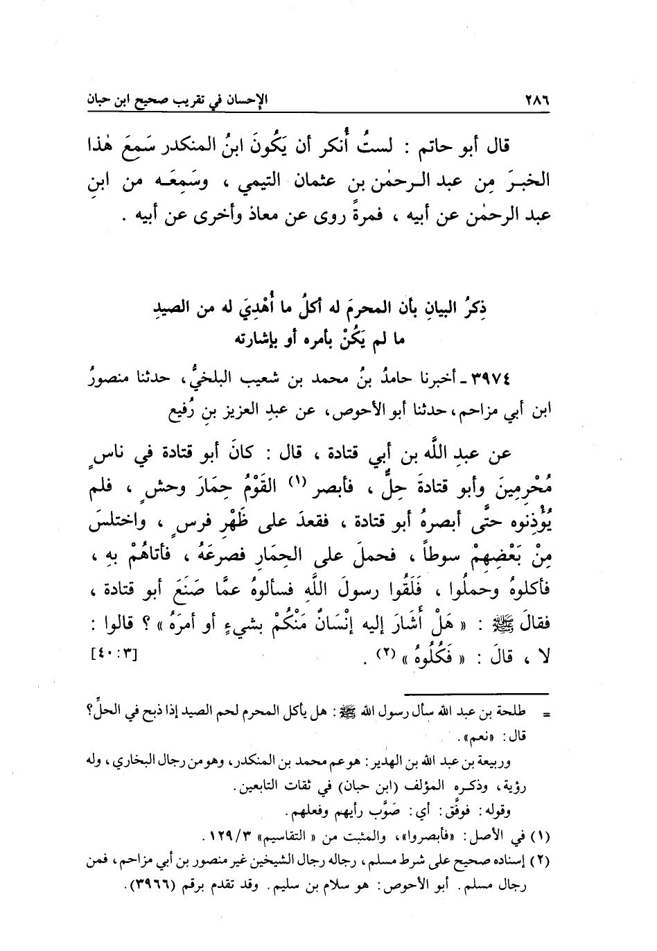 3974 - أَخْبَرَنَا حَامِدُ بْنُ مُحَمَّدِ بْنِ شُعَيْبٍ الْبَلْخِيُّ، حَدَّثَنَا مَنْصُورُ بْنُ أَبِي مُزَاحِمٍ، حَدَّثَنَا أَبُو الْأَحْوَصِ، عَنْ عَبْدِ الْعَزِيزِ بْنِ رُفَيْعٍ عَنْ عَبْدِ اللَّهِ بْنِ أَبِي قَتَادَةَ قَالَ: كَانَ أَبُو قَتَادَةَ فِي نَاسٍ مُحْرِمِينَ وَأَبُو قَتَادَةَ حِلٌّ، فَأَبْصَرَ1 الْقَوْمُ حِمَارَ وَحْشٍ، فَلَمْ يُؤْذِنُوهُ حَتَّى أَبْصَرَهُ أَبُو قَتَادَةَ، فَقَعَدَ عَلَى ظَهْرِ فَرَسٍ، وَاخْتَلَسَ مِنْ بَعْضِهِمْ سَوْطًا، فَحَمَلَ عَلَى الْحِمَارِ فَصَرَعَهُ، فَأَتَاهُمْ بِهِ، فأكلوا وَحَمَلُوا، فَلَقُوا رَسُولَ اللَّهِ فَسَأَلُوهُ عَمَّا صَنَعَ أَبُو قَتَادَةَ، فَقَالَ صَلَّى اللَّهُ عَلَيْهِ وَسَلَّمَ: "هَلْ أَشَارَ إِلَيْهِ إِنْسَانٌ مِنْكُمْ بِشَيْءٍ أَوْ أمره.؟ " قالوا: لا قال: "فكلوه" 2. [40:3]