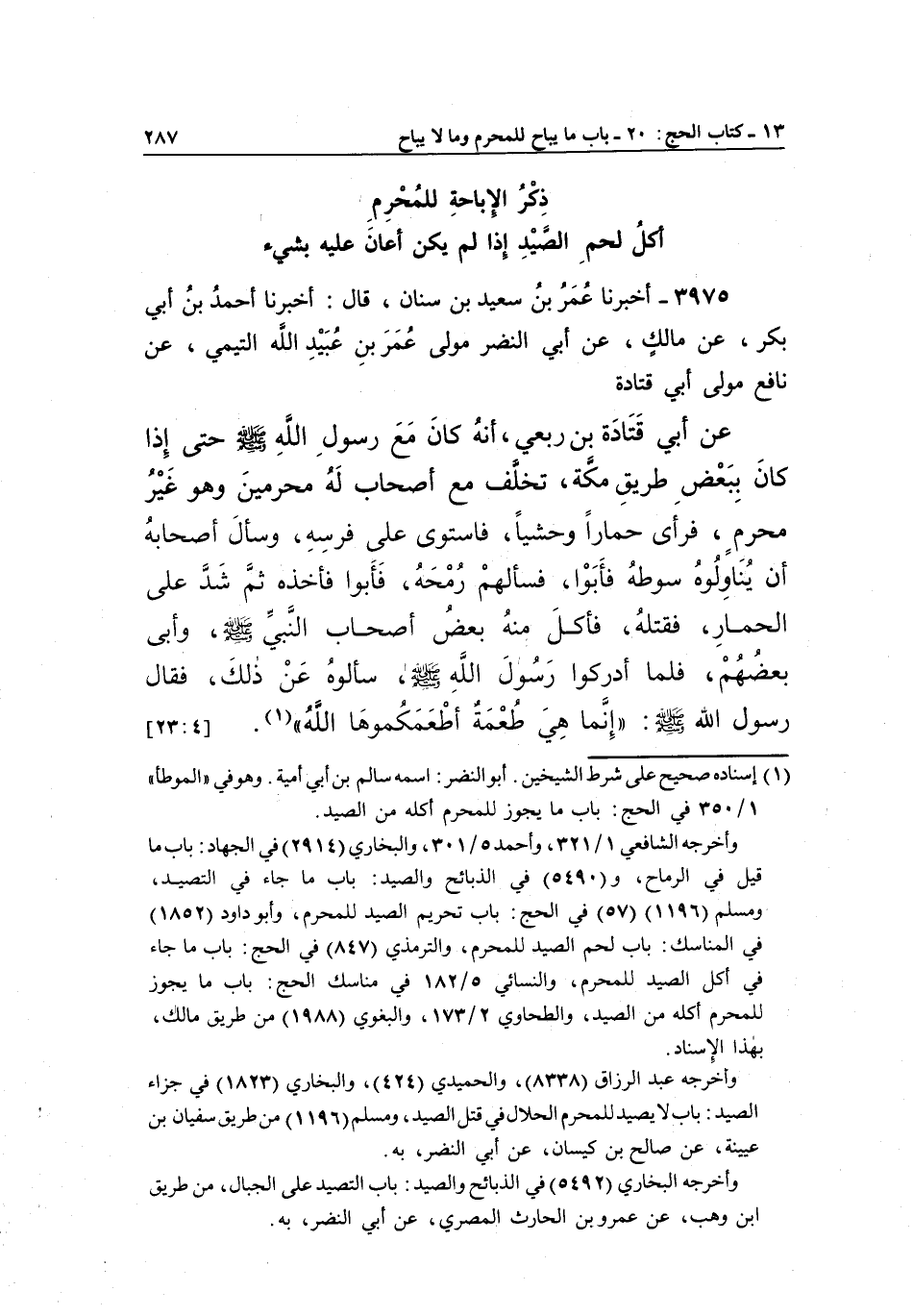 3975 - أَخْبَرَنَا عُمَرُ بْنُ سَعِيدِ بْنِ سِنَانٍ، قَالَ: أَخْبَرَنَا أَحْمَدُ بْنُ أَبِي بَكْرٍ، عَنْ مَالِكٍ، عَنْ أَبِي النَّضْرِ مَوْلَى عُمَرَ بْنِ عُبَيْدِ اللَّهِ التَّيْمِيِّ، عَنْ نَافِعٍ مَوْلَى أَبِي قَتَادَةَ عَنْ أَبِي قَتَادَةَ بْنِ رِبْعِيٍّ، أَنَّهُ كَانَ مَعَ رَسُولِ اللَّهِ صَلَّى اللَّهُ عَلَيْهِ وَسَلَّمَ حَتَّى إِذَا كَانَ بِبَعْضِ طَرِيقِ مَكَّةَ، تَخَلَّفَ مَعَ أَصْحَابٍ لَهُ مُحْرِمِينَ وَهُوَ غَيْرُ مُحْرِمٍ، فَرَأَى حِمَارًا وَحْشِيًّا، فَاسْتَوَى عَلَى فَرَسِهِ، وَسَأَلَ أَصْحَابَهُ أَنْ يُنَاوِلُوهُ سَوْطَهُ فَأَبَوْا، فَسَأَلَهُمْ رُمْحَهُ، فَأَبَوْا فَأَخَذَهُ ثُمَّ شَدَّ عَلَى الْحِمَارِ، فَقَتَلَهُ، فَأَكَلَ مِنْهُ بَعْضُ أَصْحَابِ النَّبِيِّ صَلَّى اللَّهُ عَلَيْهِ وَسَلَّمَ، وَأَبَى بَعْضُهُمْ، فَلَمَّا أَدْرَكُوا رَسُولَ اللَّهِ صَلَّى اللَّهُ عَلَيْهِ وَسَلَّمَ، سَأَلُوهُ عَنْ ذَلِكَ، فَقَالَ رَسُولُ اللَّهِ صَلَّى اللَّهُ عَلَيْهِ وَسَلَّمَ: "إِنَّمَا هي طعمة أطعمكموها الله" 1. [23:4]