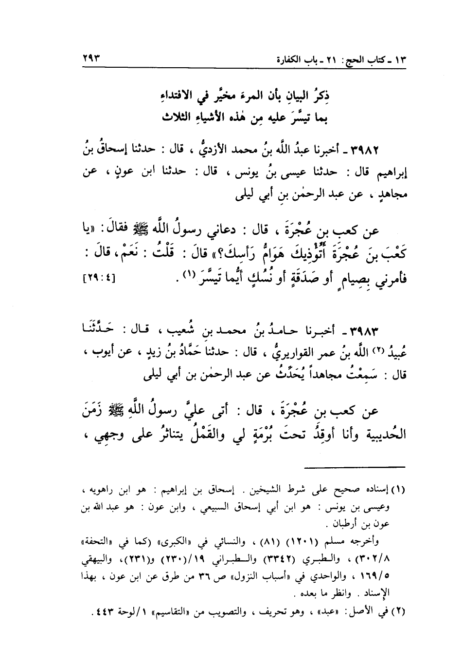 3982 - أَخْبَرَنَا عَبْدُ اللَّهِ بْنُ مُحَمَّدٍ الْأَزْدِيُّ، قَالَ: حَدَّثَنَا إِسْحَاقُ بْنُ إِبْرَاهِيمَ قَالَ: حَدَّثَنَا عِيسَى بْنُ يُونُسَ، قَالَ: حَدَّثَنَا بن عَوْنٍ، عَنْ مُجَاهِدٍ، عَنْ عَبْدِ الرَّحْمَنِ بْنِ أَبِي لَيْلَى عَنْ كَعْبِ بْنِ عُجْرَةَ قَالَ: دَعَانِي رَسُولُ اللَّهِ صَلَّى اللَّهُ عَلَيْهِ وَسَلَّمَ فَقَالَ: "يَا كَعْبُ بْنَ عُجْرَةَ أَتُؤْذِيكَ هَوَامُّ رَأْسِكَ؟ ". قَالَ: قُلْتُ: نَعَمْ، قَالَ: فَأَمَرَنِي بِصِيَامٍ أو صدقة أو نسك أيما تيسر1. [29:4]