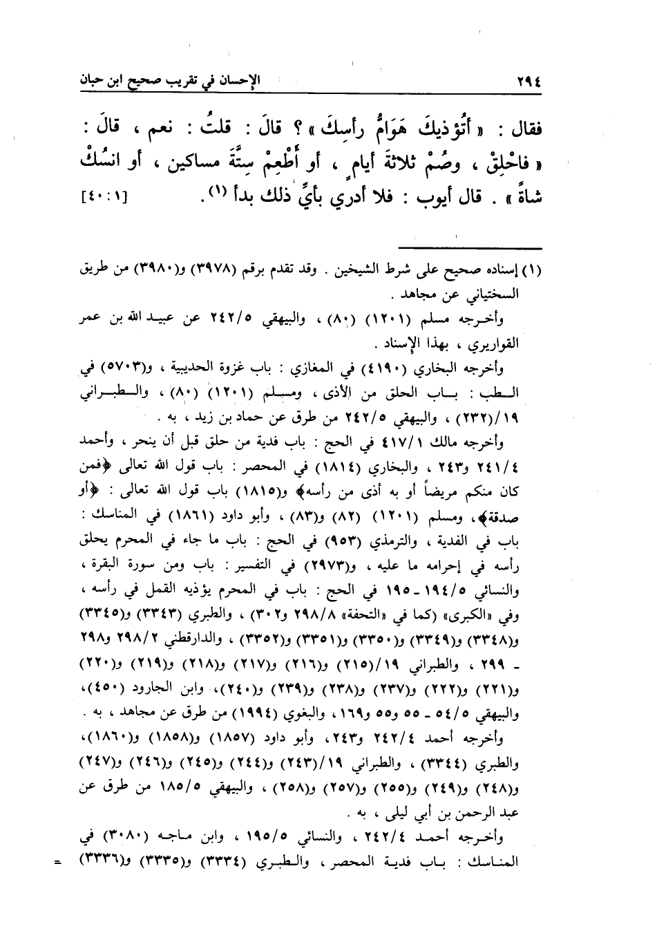 فَقَالَ: "أَتُؤْذِيكَ هَوَامُّ رَأْسِكَ؟ ". قَالَ: قُلْتُ: نَعَمْ، قَالَ: "فَاحْلِقْ، وَصُمْ ثَلَاثَةَ أَيَّامٍ، أَوْ أَطْعِمْ سِتَّةَ مَسَاكِينَ، أَوِ انْسُكْ شَاةً" قَالَ أَيُّوبُ: فلا أدري بأي ذلك بدأ 1. [40:1]