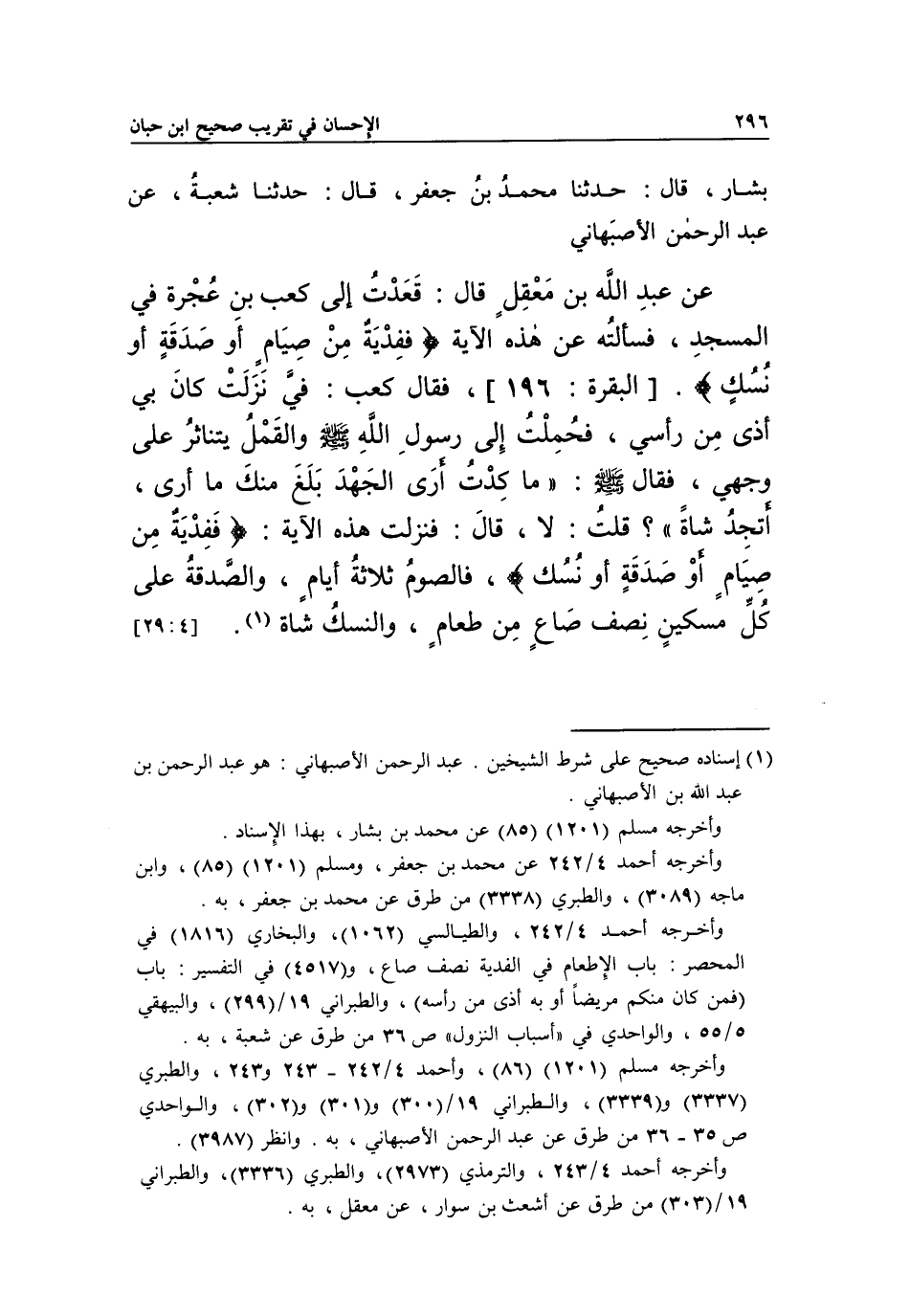 3985 - أَخْبَرَنَا عُمَرُ بْنُ مُحَمَّدٍ الْهَمْدَانِيُّ، قَالَ: حَدَّثَنَا مُحَمَّدُ بْنُ بَشَّارٍ، قَالَ: حَدَّثَنَا مُحَمَّدُ بْنُ جَعْفَرٍ، قَالَ: حَدَّثَنَا شُعْبَةُ، عَنْ عَبْدِ الرَّحْمَنِ الْأَصْبَهَانِيِّ عَنْ عَبْدِ اللَّهِ بْنِ مَعْقِلٍ، قَالَ: قَعَدْتُ إِلَى كَعْبِ بْنِ عُجْرَةَ فِي الْمَسْجِدِ، فَسَأَلْتُهُ عَنْ هَذِهِ الْآيَةِ {فَفِدْيَةٌ مِنْ صِيَامٍ أَوْ صَدَقَةٍ أَوْ نُسُكٍ} [البقرة: 196] ، فَقَالَ كَعْبٌ: فِيَّ نَزَلَتْ كَانَ بِي أَذًى مِنْ رَأْسِي، فَحُمِلْتُ إِلَى رَسُولِ اللَّهِ صَلَّى اللَّهُ عَلَيْهِ وَسَلَّمَ وَالْقَمْلُ يَتَنَاثَرُ عَلَى وَجْهِي، فَقَالَ صَلَّى اللَّهُ عَلَيْهِ وَسَلَّمَ: "مَا كِدْتُ أَرَى الْجَهْدَ بَلَغَ مِنْكَ مَا أَرَى، أَتَجِدُ شَاةً؟ " قُلْتُ: لَا، قَالَ: فَنَزَلَتْ هَذِهِ الْآيَةُ {فَفِدْيَةٌ مِنْ صِيَامٍ أَوْ صَدَقَةٍ أَوْ نُسُكٍ} [البقرة: 196] فَالصَّوْمُ ثَلَاثَةُ أَيَّامٍ، وَالصَّدَقَةُ عَلَى كُلِّ مِسْكِينٍ نِصْفُ صاع من طعام، والنسك شاة 1. [29:4]