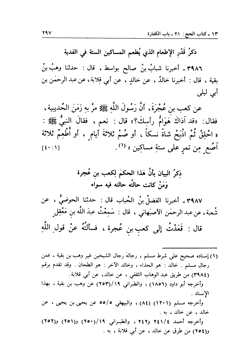 3986 - أَخْبَرَنَا شَبَابُ بْنُ صَالِحٍ بِوَاسِطَ، قَالَ: حَدَّثَنَا وَهْبُ بْنُ بَقِيَّةَ، قَالَ: أَخْبَرَنَا خَالِدٌ، عَنْ خَالِدٍ، عَنْ أَبِي قِلَابَةَ، عَنْ عَبْدِ الرَّحْمَنِ بْنِ أَبِي لَيْلَى عَنْ كَعْبِ بْنِ عُجْرَةَ، أَنَّ رَسُولَ اللَّهِ صَلَّى اللَّهُ عَلَيْهِ وَسَلَّمَ مَرَّ بِهِ زَمِنَ الْحُدَيْبِيَةِ فَقَالَ: "قَدْ آذَاكَ هَوَامُّ رَأْسِكَ؟ " قَالَ: نَعَمْ. فَقَالَ النَّبِيُّ صَلَّى اللَّهُ عَلَيْهِ وَسَلَّمَ: "احْلِقْ ثُمَّ اذْبَحْ شَاةً نُسُكًا، أَوْ صُمْ ثَلَاثَةَ أَيَّامٍ، أَوْ أَطْعِمْ ثَلَاثَةَ آصع من تمر على ستة مساكين" 1. [40:1]
