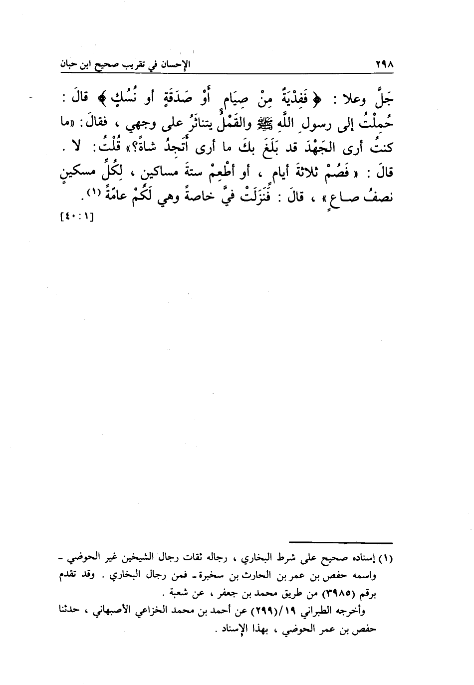 جَلَّ وَعَلَا: {فَفِدْيَةٌ مِنْ صِيَامٍ أَوْ صَدَقَةٍ أَوْ نُسُكٍ} [البقرة: 196] ، قَالَ حُمِلْتُ إِلَى رَسُولِ اللَّهِ صَلَّى اللَّهُ عَلَيْهِ وَسَلَّمَ وَالْقَمْلُ يَتَنَاثَرُ عَلَى وَجْهِي، فَقَالَ: "مَا كُنْتُ أَرَى الْجَهْدَ قَدْ بَلَغَ بِكَ مَا أَرَى، أَتَجِدُ شَاةً؟ ". قُلْتُ: لَا. قَالَ: "فَصُمْ ثَلَاثَةَ أَيَّامٍ، أَوْ أَطْعِمْ سِتَّةَ مَسَاكِينَ، لِكُلِّ مِسْكِينٍ نِصْفُ صَاعٍ". قَالَ: فَنَزَلَتْ فِي خَاصَّةٍ وَهِيَ لَكُمْ عَامَّةٌ1. [40:1]