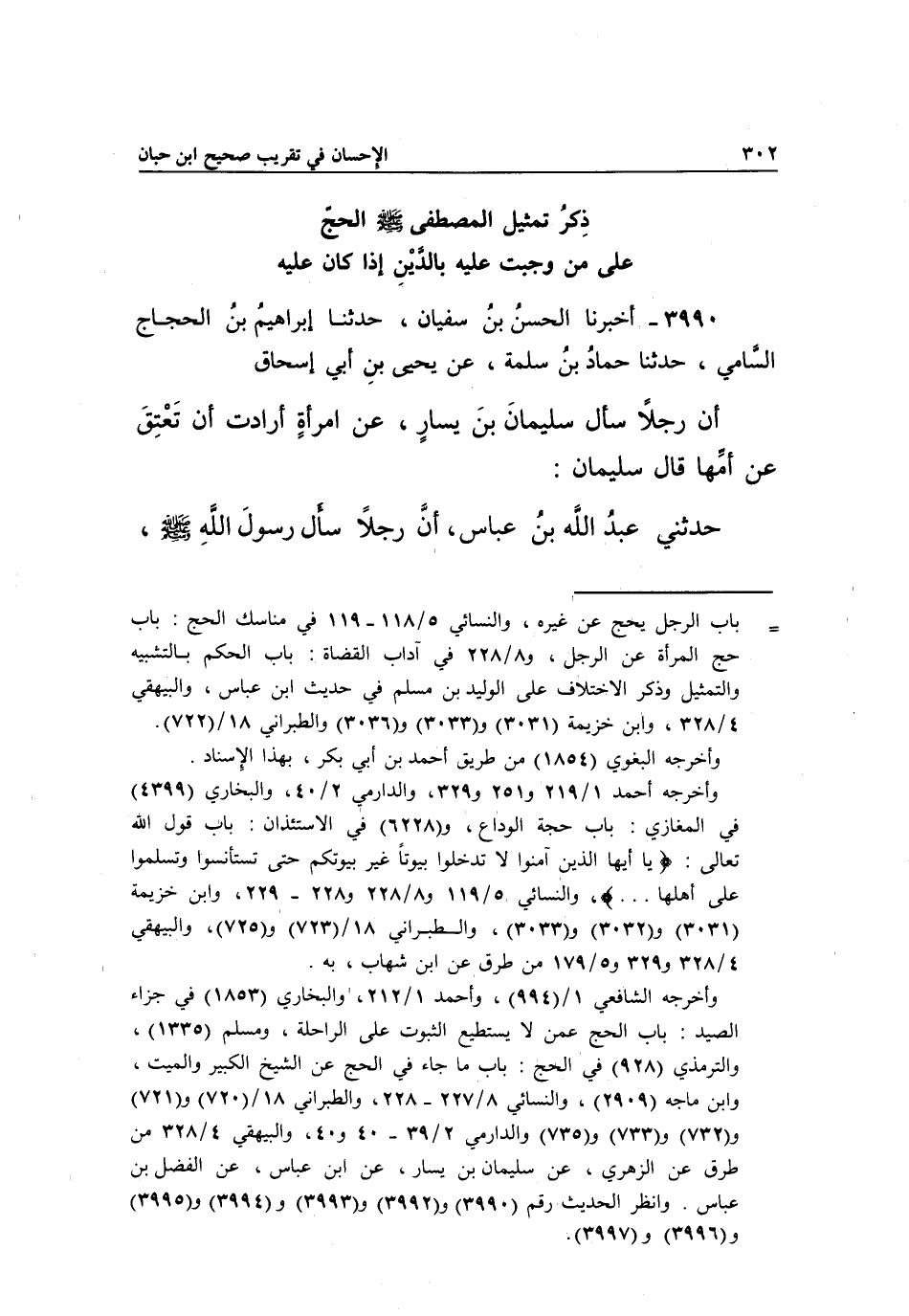 3990 - أَخْبَرَنَا الْحَسَنُ بْنُ سُفْيَانَ، حَدَّثَنَا إِبْرَاهِيمُ بْنُ الْحَجَّاجِ السَّامِيُّ، حَدَّثَنَا حَمَّادُ بْنُ سَلَمَةَ، عَنْ يَحْيَى بْنِ أَبِي إِسْحَاقَ أَنْ رَجُلًا سَأَلَ سُلَيْمَانَ بْنَ يَسَارٍ، عَنِ امْرَأَةٍ أَرَادَتْ أَنْ تَعْتِقَ عَنْ أُمِّهَا قَالَ سُلَيْمَانُ: حَدَّثَنِي عَبْدُ اللَّهِ بْنُ عَبَّاسٍ، أَنَّ رَجُلًا سَأَلَ رَسُولَ اللَّهِ صَلَّى اللَّهُ عَلَيْهِ وَسَلَّمَ، ذِكْرُ تَمْثِيلِ الْمُصْطَفَى صَلَّى اللَّهُ عَلَيْهِ وَسَلَّمَ الْحَجِّ عَلَى مَنْ وَجَبَتْ عَلَيْهِ بِالدَّيْنِ إِذَا كَانَ عَلَيْهِ