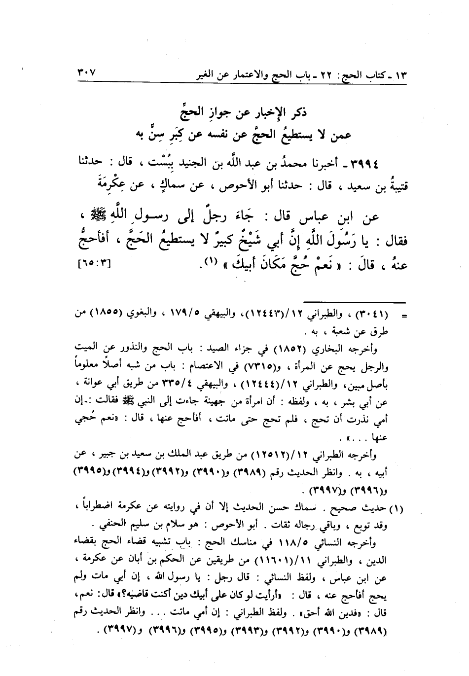 3994 - أَخْبَرَنَا مُحَمَّدُ بْنُ عَبْدِ اللَّهِ بْنِ الْجُنَيْدِ بِبُسْتَ، قَالَ: حَدَّثَنَا قُتَيْبَةُ بْنُ سَعِيدٍ، قَالَ: حَدَّثَنَا أَبُو الْأَحْوَصِ، عَنْ سِمَاكٍ، عَنْ عِكْرِمَةَ عَنِ ابْنِ عَبَّاسٍ قَالَ: جَاءَ رَجُلٌ إِلَى رَسُولِ اللَّهِ صَلَّى اللَّهُ عَلَيْهِ وَسَلَّمَ، فَقَالَ: يَا رَسُولَ اللَّهِ إِنَّ أَبِي شَيْخٌ كَبِيرٌ لَا يَسْتَطِيعُ الْحَجَّ، أَفَأَحُجُّ عَنْهُ؟، قَالَ: " نعم حج مكان أبيك" 1. [65:3]