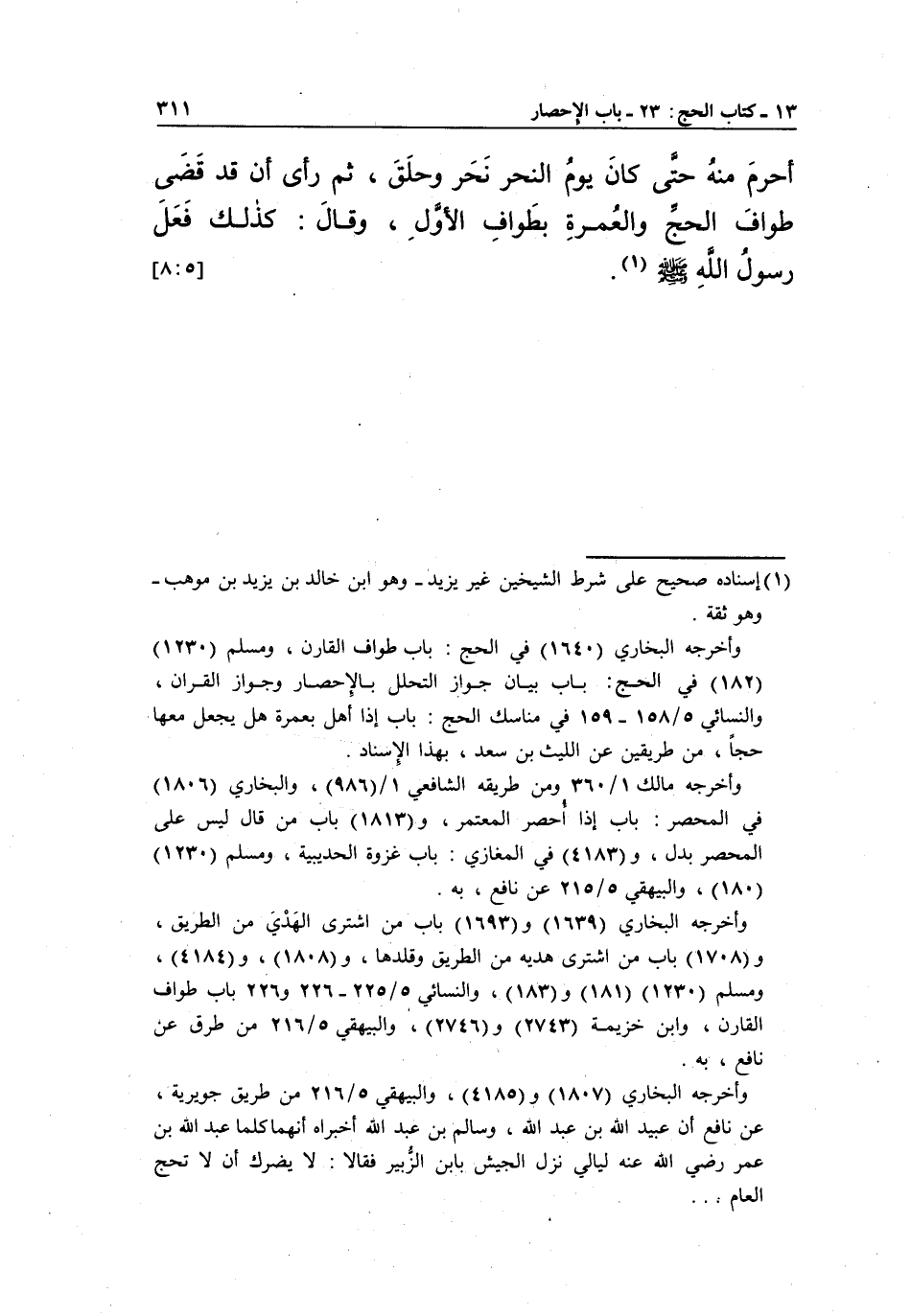 أَحْرَمَ مِنْهُ حَتَّى كَانَ يَوْمُ النَّحْرِ نَحَرَ وَحَلَقَ، ثُمَّ رَأَى أَنْ قَدْ قَضَى طَوَافَ الْحَجِّ وَالْعُمْرَةِ بِطَوَافِ الْأَوَّلِ، وَقَالَ: كَذَلِكَ فَعَلَ رَسُولُ اللَّهِ صَلَّى اللَّهُ عَلَيْهِ وَسَلَّمَ1. [8:5]