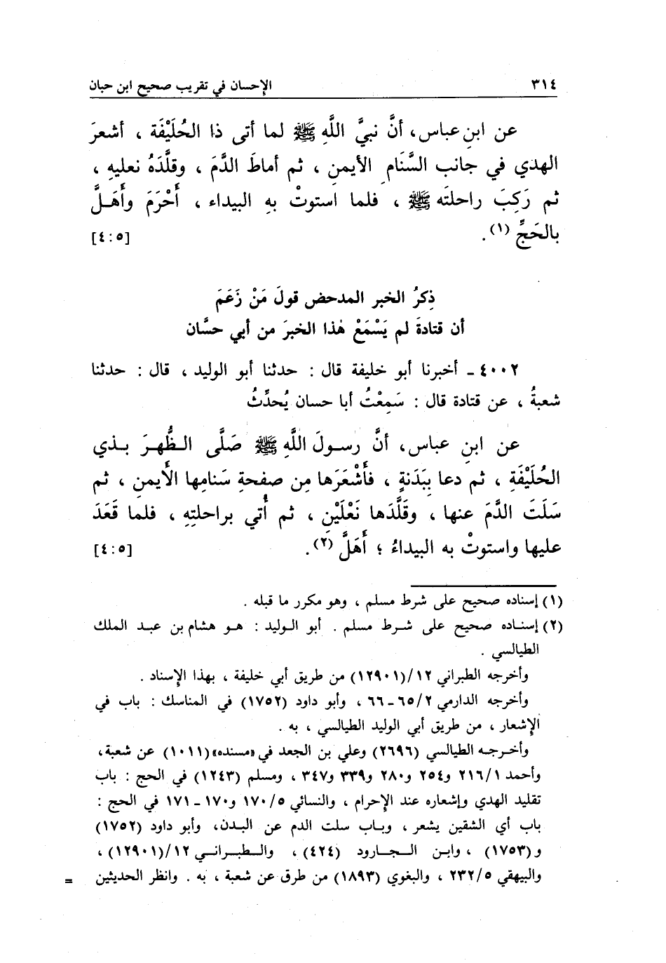 4002 - أخبرنا أبو خليفة، قال: حدثنا الْوَلِيدِ، قَالَ: حَدَّثَنَا شُعْبَةُ، عَنْ قَتَادَةَ قَالَ: سَمِعْتُ أَبَا حَسَّانَ يُحَدِّثُ عَنِ ابْنِ عَبَّاسٍ، أَنَّ رَسُولَ اللَّهِ صَلَّى الله عليه وسلم صَلَّى الظُّهْرَ بِذِي الْحُلَيْفَةِ ثُمَّ دَعَا بِبَدَنَةٍ فَأَشْعَرَهَا مِنْ صَفْحَةِ سَنَامِهَا الْأَيْمَنِ، ثُمَّ سَلَتَ الدَّمَ عَنْهَا، وَقَلَّدَهَا نَعْلَيْنِ، ثُمَّ أُتِيَ بِرَاحِلَتِهِ، فَلَمَّا قَعَدَ عَلَيْهَا وَاسْتَوَتْ بِهِ الْبَيْدَاءُ؛ أَهَلَّ1. [4:5]