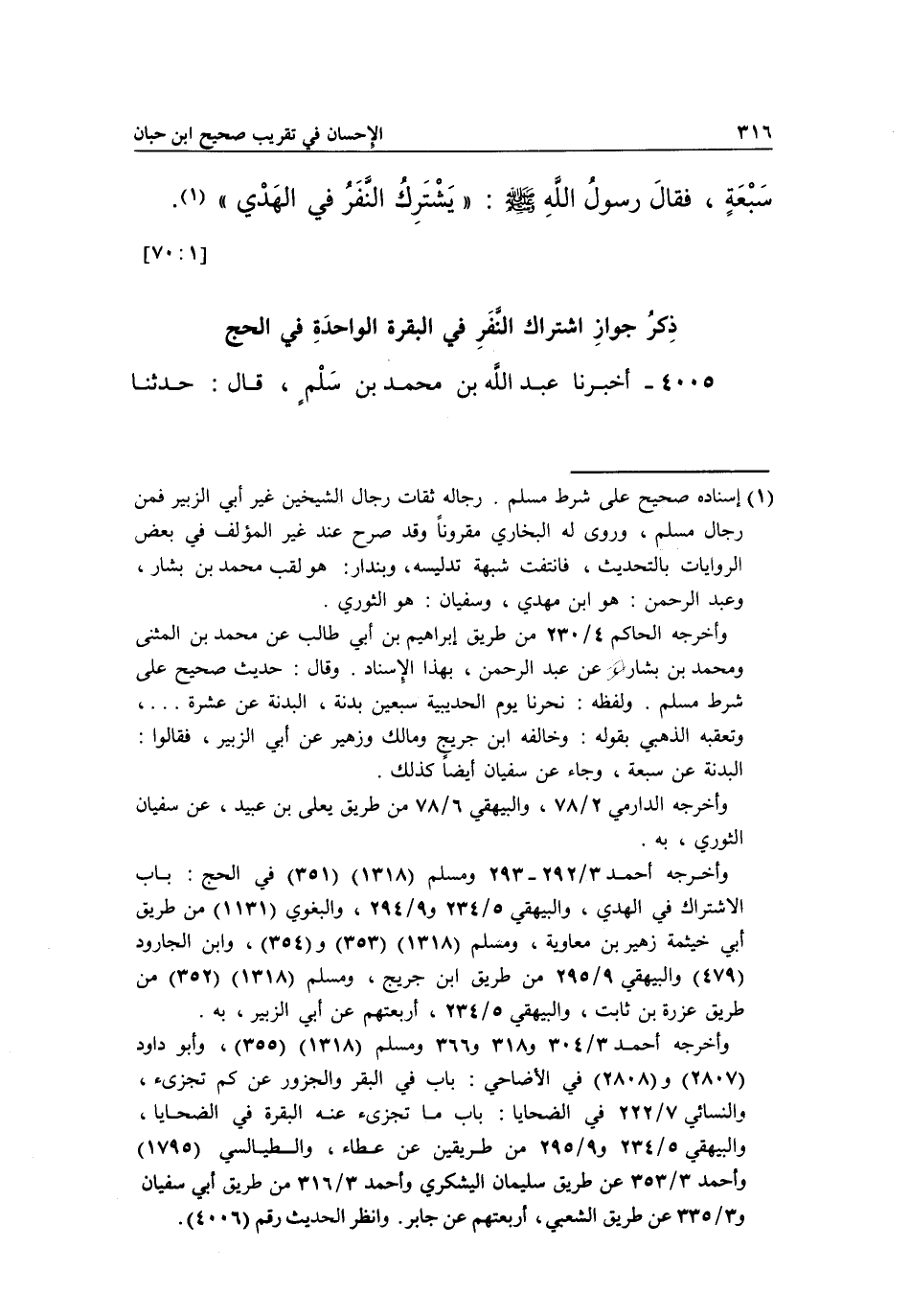 وأخرجه الحاكم4/230، من طريق إبراهيم بن أبي طال، عن محمد بن المثنى ومحمد بن بشار، عن عبد الرحمن بهذا الإسناد، وقال: حديث صحيح على شرط مسلم، ولفظه: نحرن يوم الحديبية سبعين بدنة، البدنة عن عشرة، وتعقبه الذهبي بقوله: وخالفه ابن جريج ومالك وزهير عن أبي الزبير، فقالوا: البدنة عن سبعة، وجاء عن سفيان كذلك.