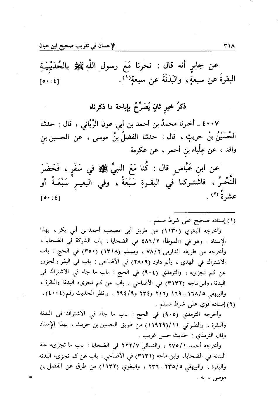 4007 - أَخْبَرَنَا مُحَمَّدُ بْنُ أَحْمَدَ بْنِ أَبِي عَوْنٍ الرَّيَانِيُّ، قَالَ: حَدَّثَنَا الْحُسَيْنُ بْنُ حُرَيْثٍ، قَالَ: حَدَّثَنَا الْفَضْلُ بْنُ مُوسَى، عَنِ الْحُسَيْنِ بْنِ وَاقِدٍ، عَنْ عِلْبَاءِ بْنِ أَحْمَرَ، عَنْ عِكْرِمَةَ، عَنِ ابْنِ عَبَّاسٍ قَالَ: كُنَّا مَعَ النَّبِيِّ صَلَّى اللَّهُ عَلَيْهِ وَسَلَّمَ فِي سَفَرٍ فَحَضَرَ النَّحْرُ، فَاشْتَرَكْنَا فِي الْبَقَرَةِ سَبْعَةً، وَفِي الْبَعِيرِ سبعة أو عشرة1. [50:4]