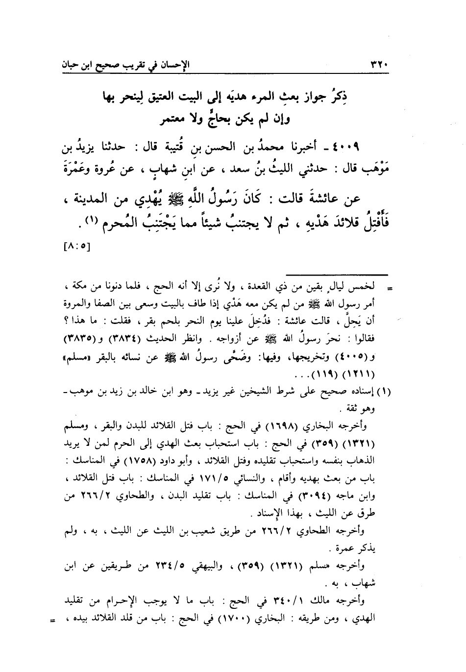4009 - أَخْبَرَنَا مُحَمَّدُ بْنُ الْحَسَنِ بْنِ قُتَيْبَةَ قَالَ: حَدَّثَنَا يَزِيدُ بْنُ مَوْهَبٍ قَالَ: حَدَّثَنِي اللَّيْثُ بن سعد، عن بن شهاب، عن عروة وعمرة عَنْ عَائِشَةَ قَالَتْ: كَانَ رَسُولُ اللَّهِ صَلَّى اللَّهُ عَلَيْهِ وَسَلَّمَ يَهْدِي مِنَ الْمَدِينَةِ، فَأَفْتِلُ قَلَائِدَ هَدْيِهِ، ثُمَّ لا يجتنب شيئا مما يجتنب المحرم 1. [8:5]