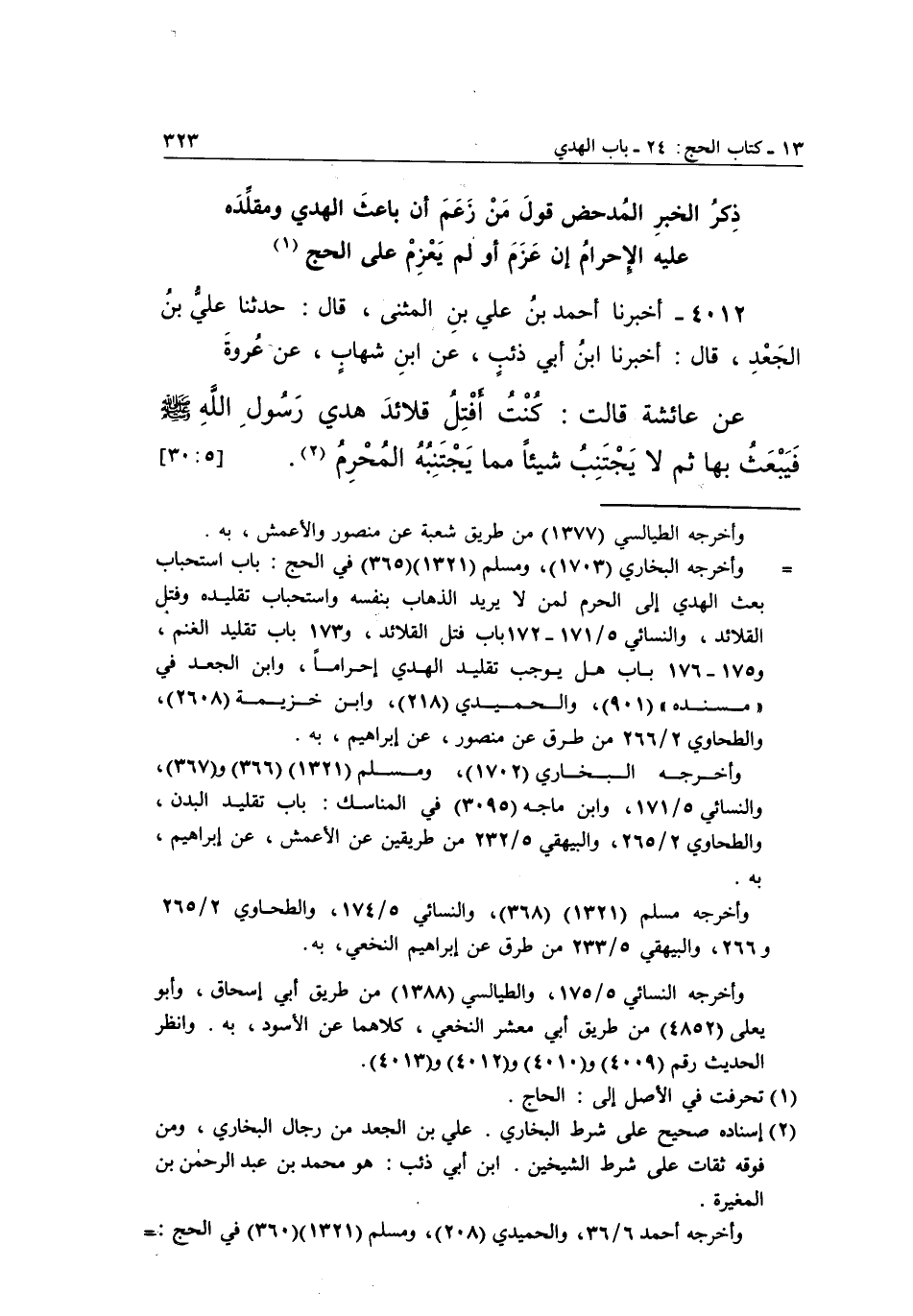 4012 - أَخْبَرَنَا أَحْمَدُ بْنُ عَلِيِّ بْنِ الْمُثَنَّى، قَالَ: حَدَّثَنَا عَلِيُّ بن الجعد، قال: أخبرنا بن أبي ذئب، عن بن شِهَابٍ، عَنْ عُرْوَةَ، عَنْ عَائِشَةَ قَالَتْ: كُنْتُ أَفْتِلُ قَلَائِدَ هَدْيِ رَسُولِ اللَّهِ صَلَّى اللَّهُ عَلَيْهِ وَسَلَّمَ فَيَبْعَثُ بِهَا ثُمَّ لَا يَجْتَنِبُ شيئا مما يجتنبه المحرم2. [30:5]