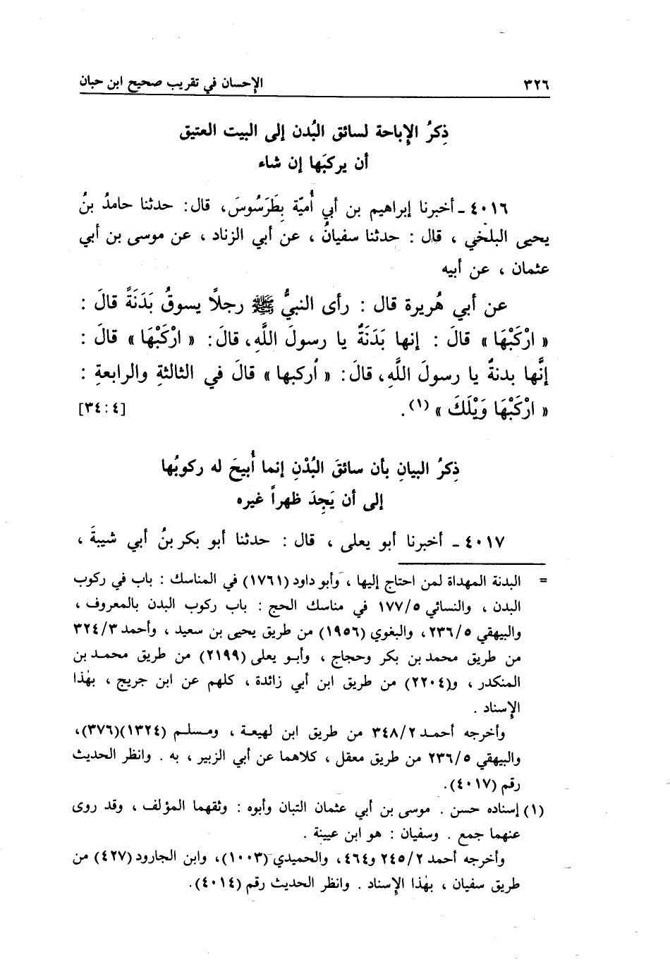 4016 - أَخْبَرَنَا إِبْرَاهِيمُ بْنُ أَبِي أُمَيَّةَ بِطَرَسُوسَ، قَالَ: حَدَّثَنَا حَامِدُ بْنُ يَحْيَى الْبَلْخِيُّ، قَالَ: حَدَّثَنَا سُفْيَانُ، عَنْ أَبِي الزِّنَادِ، عَنِ مُوسَى بْنِ أَبِي عُثْمَانَ، عَنْ أَبِيهِ، عَنْ أَبِي هُرَيْرَةَ قَالَ: رَأَى النَّبِيُّ صَلَّى اللَّهُ عَلَيْهِ وَسَلَّمَ رَجُلًا يَسُوقُ بَدَنَةً قَالَ: "ارْكَبْهَا"، قَالَ: إِنَّهَا بَدَنَةٌ يَا رَسُولَ اللَّهِ، قَالَ: "ارْكَبْهَا"، قَالَ: إِنَّهَا بَدَنَةٌ يَا رَسُولَ اللَّهِ، قَالَ: "ارْكَبْهَا"، قَالَ فِي الثَّالِثَةِ والرابعة: "اركبها ويلك" 1. [34:4]