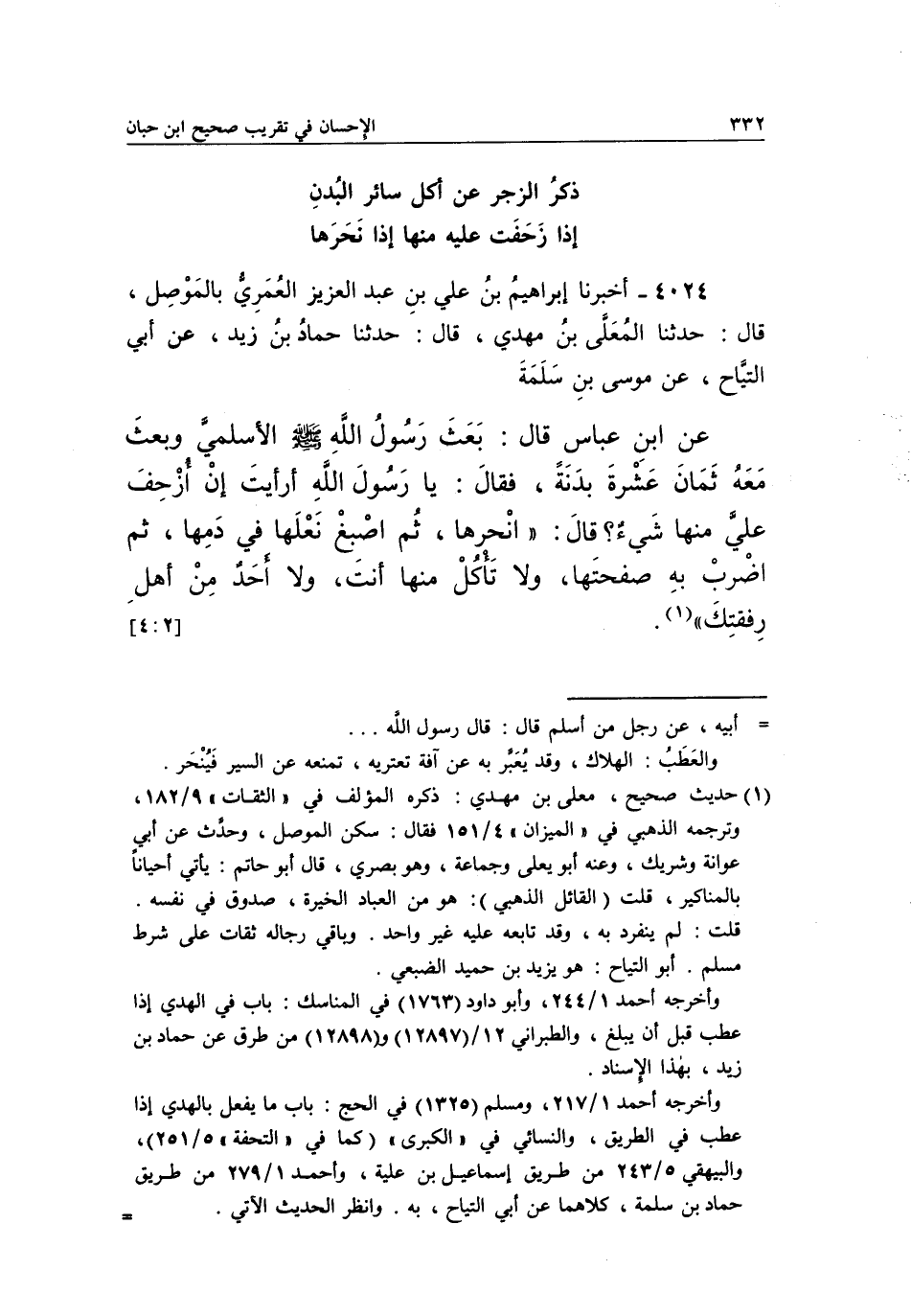 4024 - أَخْبَرَنَا إِبْرَاهِيمُ بْنُ عَلِيِّ بْنِ عَبْدِ الْعَزِيزِ الْعُمَرِيُّ بِالْمَوْصِلِ، قَالَ: حَدَّثَنَا الْمُعَلَّى بْنُ مَهْدِيٍّ، قَالَ: حَدَّثَنَا حَمَّادُ بْنُ زَيْدٍ، عَنْ أَبِي التَّيَّاحِ، عَنْ موسى بن سلمة، عن بن عَبَّاسٍ قَالَ: بَعَثَ رَسُولُ اللَّهِ صَلَّى اللَّهُ عَلَيْهِ وَسَلَّمَ الْأَسْلَمِيَّ وَبَعَثَ مَعَهُ ثَمَانَ عَشْرَةَ بَدَنَةً، فَقَالَ: يَا رَسُولَ اللَّهِ أَرَأَيْتَ إِنْ أُزْحِفَ عَلَيَّ مِنْهَا شَيْءٌ؟ قَالَ: "انْحَرْهَا، ثُمَّ اصْبِغْ نَعْلَهَا فِي دَمِهَا، ثُمَّ اضْرِبْ بِهِ صفحتها، ولا تأكل منها أنت، ولا أحد من أهل رفقتك" 1. [4:2]