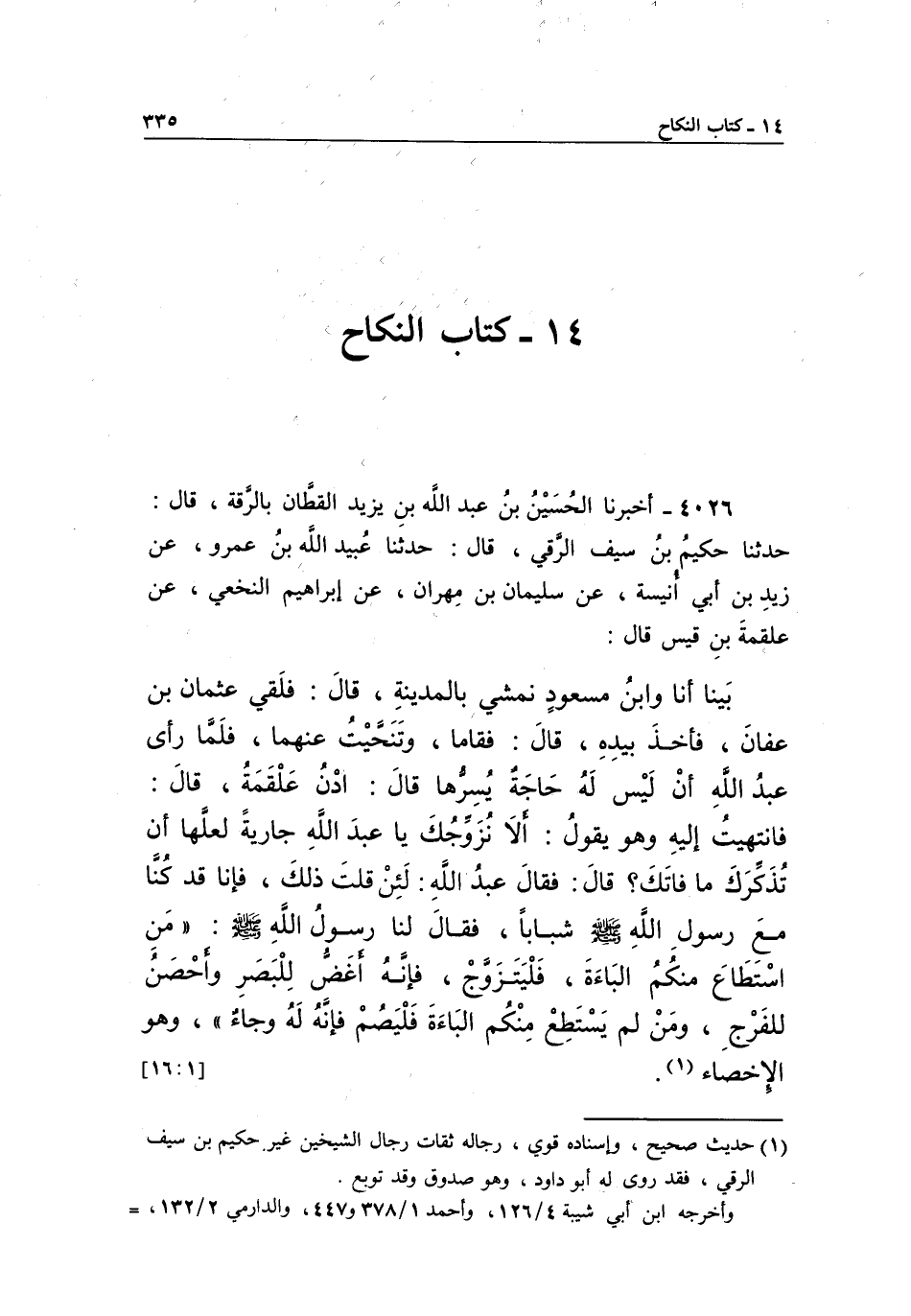 4026 - أَخْبَرَنَا الْحُسَيْنُ بْنُ عَبْدِ اللَّهِ بْنِ يَزِيدَ الْقَطَّانُ بِالرَّقَّةِ، قَالَ: حَدَّثَنَا حَكِيمُ بْنُ سَيْفٍ الرَّقِّيُّ، قَالَ: حَدَّثَنَا عُبَيْدُ اللَّهِ بْنُ عَمْرٍو، عَنْ زَيْدِ بْنِ أَبِي أُنَيْسَةَ، عَنْ سُلَيْمَانَ بْنِ مِهْرَانَ، عَنْ إِبْرَاهِيمَ النَّخَعِيِّ، عَنْ عَلْقَمَةَ بْنِ قَيْسٍ قَالَ: بَيْنَا أَنَا وَابْنُ مَسْعُودٍ نَمْشِي بِالْمَدِينَةِ، قَالَ: فَلَقِيَ عُثْمَانُ بْنُ عَفَّانَ فَأَخَذَ بِيَدِهِ، قَالَ: فَقَامَا، وَتَنَحَّيْتُ عَنْهُمَا، فَلَمَّا رَأَى عَبْدُ اللَّهِ أَنْ لَيْسَ لَهُ حَاجَةٌ يَسِرُّهَا قَالَ: ادْنُ عَلْقَمَةُ، قَالَ: فَانْتَهَيْتُ إِلَيْهِ وَهُوَ يَقُولُ: أَلَا نُزَوِّجُكَ يَا عَبْدَ اللَّهِ جَارِيَةً لَعَلَّهَا أَنْ تُذَكِّرَكَ مَا فَاتَكَ؟ قَالَ: فَقَالَ عَبْدُ اللَّهِ: لَئِنْ قُلْتَ ذَلِكَ، فَإِنَّا قَدْ كُنَّا مَعَ رَسُولِ اللَّهِ صَلَّى اللَّهُ عَلَيْهِ وَسَلَّمَ شَبَابًا، فَقَالَ لَنَا رَسُولُ اللَّهِ صَلَّى اللَّهُ عَلَيْهِ وَسَلَّمَ: "من اسْتَطَاعَ مِنْكُمُ الْبَاءَةَ فَلْيَتَزَوَّجْ؛ فَإِنَّهُ أَغَضُّ لِلْبَصَرِ وَأَحْصَنُ لِلْفَرْجِ، وَمَنْ لَمْ يَسْتَطِعْ مِنْكُمُ الْبَاءَةَ فليصم فإنه له وجاء". وهو الإخصاء 1. [16:1]