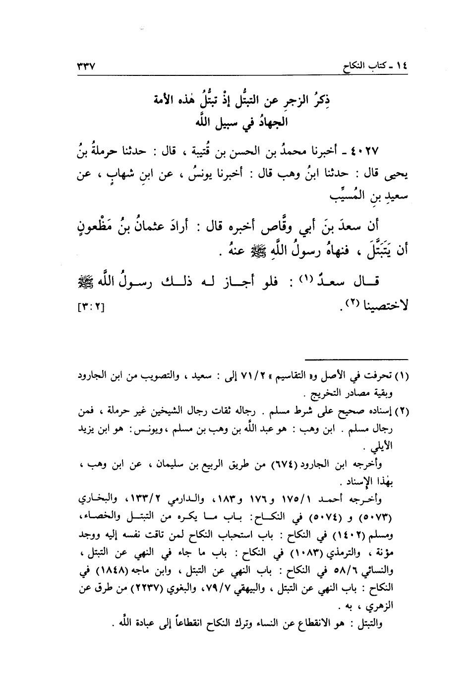 4027 - أَخْبَرَنَا مُحَمَّدُ بْنُ الْحَسَنِ بْنِ قُتَيْبَةَ، قَالَ: حَدَّثَنَا حَرْمَلَةُ بْنُ يَحْيَى، قَالَ: حَدَّثَنَا بن وهب، قال: أخبرنا يونس، عن بن شِهَابٍ، عَنْ سَعِيدِ بْنِ الْمُسَيِّبِ أَنَّ سَعْدَ بْنَ أَبِي وَقَّاصٍ أَخْبَرَهُ قَالَ: أَرَادَ عُثْمَانُ بْنُ مَظْعُونٍ أَنْ يَتَبَتَّلَ، فَنَهَاهُ رَسُولُ اللَّهِ صَلَّى اللَّهُ عَلَيْهِ وَسَلَّمَ عَنْهُ.