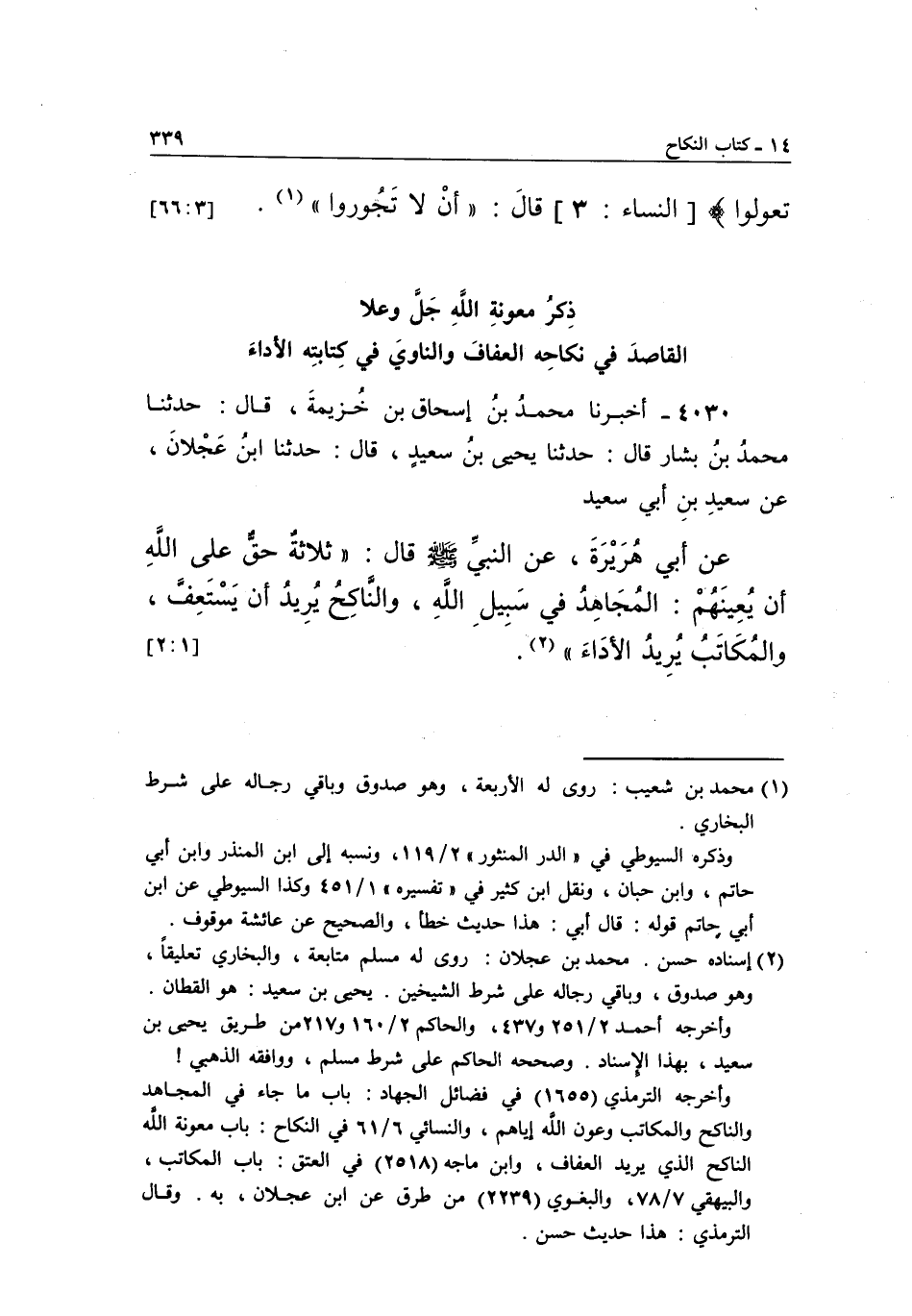 4030 - أَخْبَرَنَا مُحَمَّدُ بْنُ إِسْحَاقَ بْنِ خُزَيْمَةَ، قَالَ: حَدَّثَنَا مُحَمَّدُ بْنُ بَشَّارٍ قَالَ: حَدَّثَنَا يَحْيَى بْنُ سَعِيدٍ، قَالَ: حَدَّثَنَا ابْنِ عَجْلَانَ، عَنْ سَعِيدِ بْنِ أَبِي سَعِيدٍ، عَنْ أَبِي هُرَيْرَةَ، عَنِ النَّبِيِّ صَلَّى اللَّهُ عَلَيْهِ وَسَلَّمَ قَالَ: "ثَلَاثَةٌ حَقٌّ عَلَى اللَّهِ أَنْ يُعِينَهُمُ: الْمُجَاهِدُ فِي سَبِيلِ اللَّهِ، وَالنَّاكِحُ يُرِيدُ أَنْ يستعف، والمكاتب يريد الأداء" 1. [2:1]