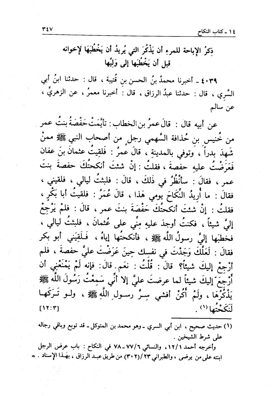 4039 - أَخْبَرَنَا مُحَمَّدُ بْنُ الْحَسَنِ بْنِ قُتَيْبَةَ، قَالَ: حدثنا بْنُ أَبِي السَّرِيِّ، قَالَ: حَدَّثَنَا عَبْدُ الرَّزَّاقِ، قَالَ: أَخْبَرَنَا مَعْمَرٌ، عَنِ الزُّهْرِيِّ، عَنْ سَالِمٍ، عَنِ أَبِيهِ قَالَ: قَالَ عُمَرُ بْنُ الْخَطَّابِ: تَأَيَّمَتْ حَفْصَةُ بِنْتُ عُمَرَ مِنْ خُنَيْسِ بْنِ حُذَافَةَ السَّهْمِيِّ رَجُلٌ مِنْ أَصْحَابِ النَّبِيِّ صَلَّى اللَّهُ عَلَيْهِ وَسَلَّمَ مِمَّنْ شَهِدَ بَدْرًا، وَتُوُفِّيَ بِالْمَدِينَةِ، قَالَ عُمَرُ: فَلَقِيتُ عُثْمَانَ بْنَ عَفَّانَ فَعَرَضْتُ عَلَيْهِ حَفْصَةَ، فَقُلْتُ: إِنْ شِئْتَ أَنْكَحْتُكَ حَفْصَةَ بِنْتَ عُمَرَ، فَقَالَ: سَأَنْظُرُ فِي ذَلِكَ، قَالَ: فَلَبِثْتُ لَيَالِيَ، فَلَقِيَنِي، فَقَالَ: مَا أُرِيدُ النِّكَاحَ يَوْمِي هَذَا، قَالَ عُمَرُ: فَلَقِيتُ أَبَا بَكْرٍ، فَقُلْتُ: إِنْ شِئْتَ أَنْكَحْتُكَ حَفْصَةَ بِنْتَ عُمَرَ، قَالَ: فَلَمْ يَرْجِعْ إِلَيَّ شَيْئًا، فَكُنْتُ أَوْجَدَ عَلَيْهِ مِنِّي عَلَى عُثْمَانَ، فَلَبِثْتُ لَيَالِيَ، فَخَطَبَهَا إِلَى رَسُولِ اللَّهِ صَلَّى اللَّهُ عَلَيْهِ وَسَلَّمَ، فَأَنْكَحْتُهَا إِيَّاهُ، فَلَقِيَنِي أَبُو بَكْرٍ فَقَالَ: لَعَلَّكَ وَجَدْتَ فِي نَفْسِكَ حِينَ عَرَضْتَ عَلَيَّ حَفْصَةَ، فَلَمْ أَرْجِعْ إِلَيْكَ شَيْئًا؟ قَالَ: قُلْتُ: نَعَمْ، قَالَ: فَإِنَّهُ لَمْ يَمْنَعْنِي أَنْ أَرْجِعَ إِلَيْكَ شَيْئًا لَمَّا عَرَضْتَ عَلَيَّ إِلَّا إِنِّي سَمِعْتُ رَسُولَ اللَّهِ صَلَّى اللَّهُ عَلَيْهِ وَسَلَّمَ يَذْكُرُهَا، وَلَمْ أَكُنْ أُفْشِي سِرَّ رَسُولِ اللَّهِ صَلَّى اللَّهُ عَلَيْهِ وَسَلَّمَ، وَلَوْ تركها لنكحتها 1. [12:3]