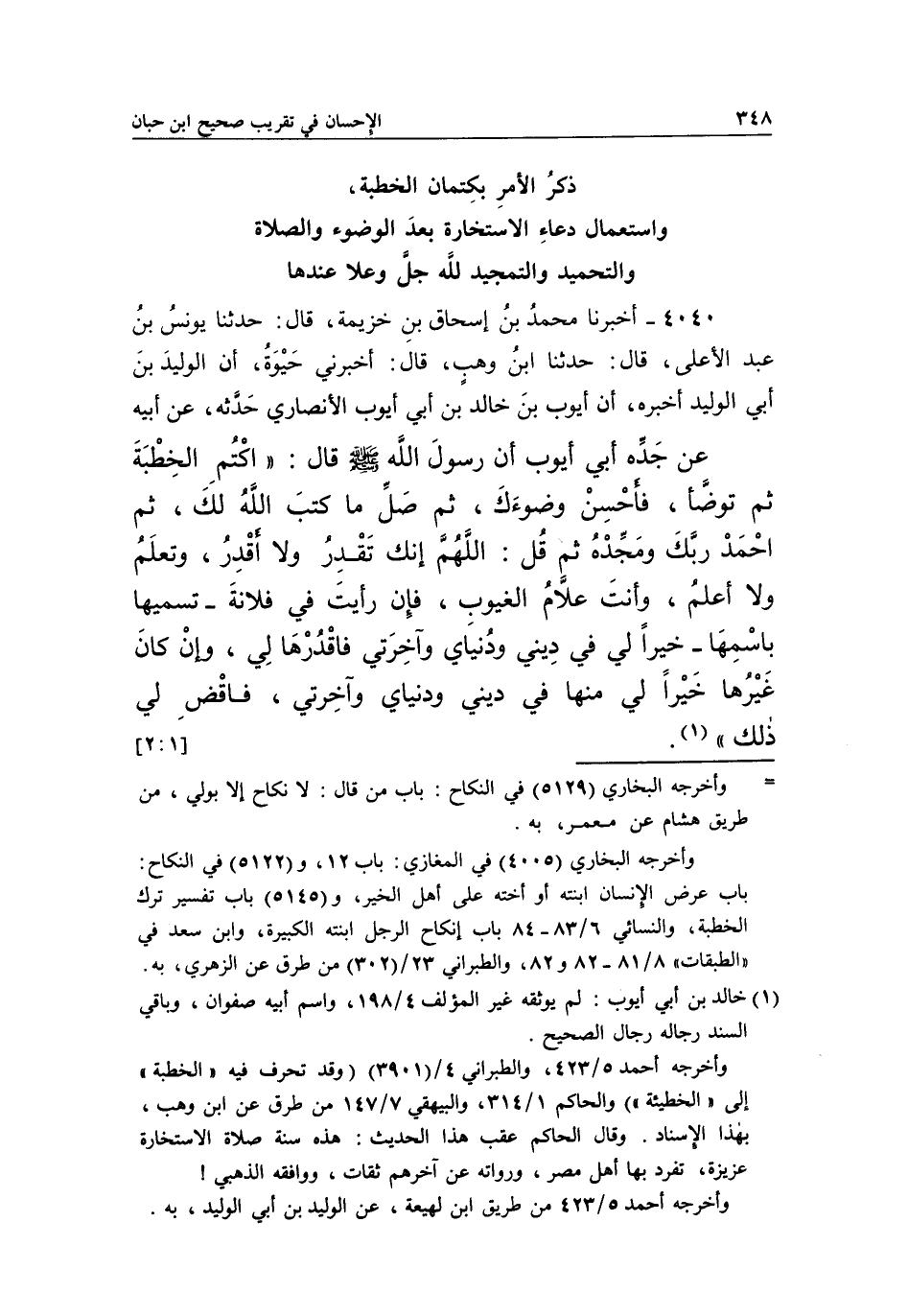 4040 - أَخْبَرَنَا مُحَمَّدُ بْنُ إِسْحَاقَ بْنِ خُزَيْمَةَ، قَالَ: حَدَّثَنَا يُونُسُ بْنُ عَبْدِ الْأَعْلَى، قَالَ: حَدَّثَنَا بن وَهْبٍ، قَالَ: أَخْبَرَنِي حَيْوَةُ أَنَّ الْوَلِيدَ بْنَ أَبِي الْوَلِيدِ، أَخْبَرَهُ أَنَّ أَيُّوبَ بْنَ خَالِدِ بْنِ أَبِي أَيُّوبَ الْأَنْصَارِيَّ، حَدَّثَهُ عَنْ أَبِيهِ، عَنْ جَدِّهِ أَبِي أَيُّوبَ أَنَّ رَسُولَ اللَّهِ صَلَّى اللَّهُ عَلَيْهِ وَسَلَّمَ قَالَ: "اكْتُمِ الْخِطْبَةَ ثُمَّ تَوَضَّأْ، فَأَحْسِنْ وضُوءَكَ، ثُمَّ صَلِّ مَا كَتَبَ اللَّهُ لَكَ، ثُمَّ احْمَدْ رَبَّكَ وَمَجِّدْهُ ثُمَّ قُلْ: اللَّهُمَّ إِنَّكَ تَقْدِرُ وَلَا أَقْدِرُ، وَتَعْلَمُ وَلَا أَعْلَمُ، وَأَنْتَ عَلَّامُ الْغُيُوبِ، فَإِنْ رَأَيْتَ فِيَ فُلَانَةِ -وَتُسَمِّيهَا بِاسْمِهَا- خَيْرًا لِي فِي دِينِي وَدُنْيَايَ وَآخِرَتِي فَاقْدُرْهَا لِي، وَإِنْ كَانَ غَيْرُهَا خَيْرًا لِي مِنْهَا فِي دِينِي ودنياي وآخرتي، فاقض لي ذلك" 1. [2:1]