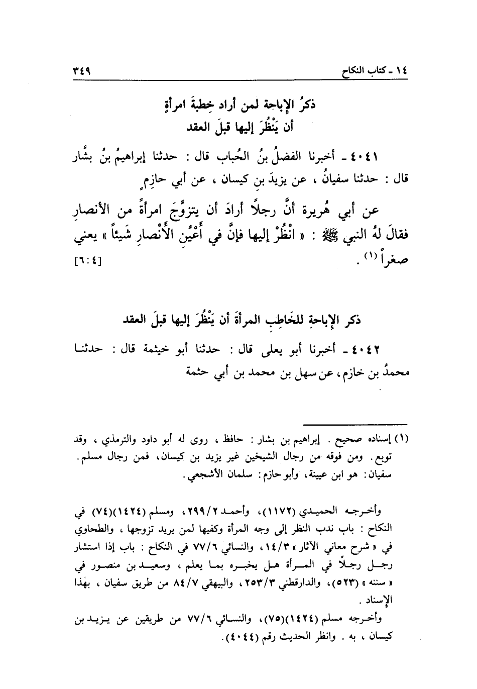 4041 - أَخْبَرَنَا الْفَضْلُ بْنُ الْحُبَابِ، قَالَ: حَدَّثَنَا إِبْرَاهِيمُ بْنُ بَشَّارٍ، قَالَ: حَدَّثَنَا سُفْيَانُ، عَنْ يَزِيدَ بْنِ كَيْسَانَ، عَنْ أَبِي حَازِمٍ، عَنْ أَبِي هُرَيْرَةَ أَنَّ رَجُلًا أَرَادَ أَنْ يَتَزَوَّجَ امْرَأَةً مِنَ الْأَنْصَارِ فَقَالَ لَهُ النَّبِيُّ صَلَّى اللَّهُ عَلَيْهِ وَسَلَّمَ: "انْظُرْ إِلَيْهَا فَإِنَّ فِي أَعْيُنِ الْأَنْصَارِ شَيْئًا" يَعْنِي صغرا1. [6:4]