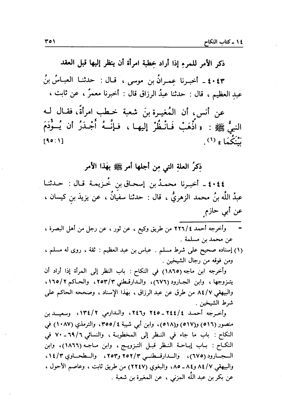 4043 - أَخْبَرَنَا عِمْرَانُ بْنُ مُوسَى، قَالَ: حَدَّثَنَا الْعَبَّاسُ بْنُ عَبْدِ الْعَظِيمِ، قَالَ: حَدَّثَنَا عَبْدُ الرَّزَّاقِ، قَالَ: أَخْبَرَنَا مَعْمَرٌ، عَنْ ثَابِتٍ، عَنْ أَنَسٍ، أَنَّ الْمُغِيرَةَ بْنَ شُعْبَةَ خَطَبَ امْرَأَةً، فَقَالَ لَهُ النَّبِيُّ صَلَّى اللَّهُ عَلَيْهِ وَسَلَّمَ: "اذْهَبْ فَانْظُرْ إِلَيْهَا، فإنه أجدر أن يؤدم بينكما" 1. [95:1]