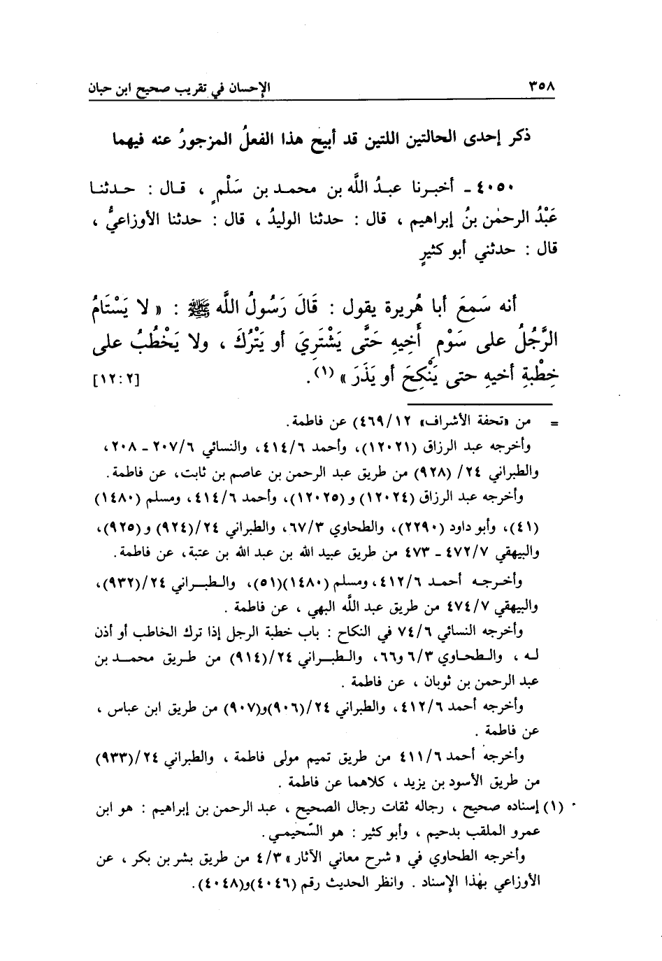 4050 - أَخْبَرَنَا عَبْدُ اللَّهِ بْنُ مُحَمَّدِ بْنِ سَلْمٍ، قَالَ: حَدَّثَنَا عَبْدُ الرَّحْمَنِ بْنُ إِبْرَاهِيمَ، قَالَ: حَدَّثَنَا الْوَلِيدُ، قَالَ: حدثنا الأوزاعي، أَنَّهُ سَمِعَ أَبَا هُرَيْرَةَ يَقُولُ: قَالَ رَسُولُ اللَّهِ صَلَّى اللَّهُ عَلَيْهِ وَسَلَّمَ: "لَا يَسْتَامُ الرَّجُلُ عَلَى سَوْمِ أَخِيهِ حَتَّى يَشْتَرِيَ أَوْ يَتْرُكَ، وَلَا يَخْطُبُ عَلَى خِطْبَةِ أَخِيهِ حَتَّى يَنْكِحَ أَوْ يَذَرَ" 1. [12:2]