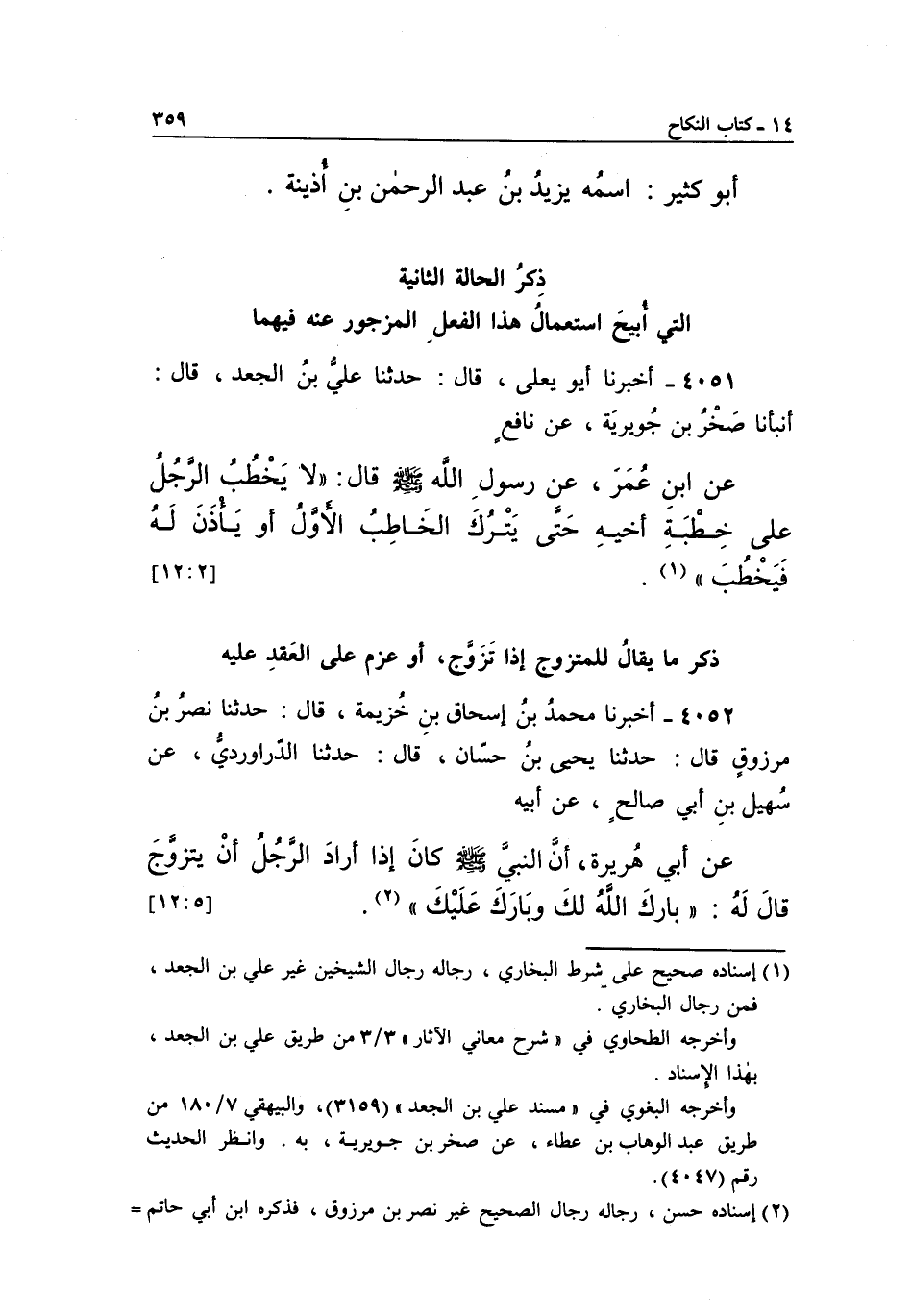 4051 - أَخْبَرَنَا أَبُو يَعْلَى، قَالَ: حَدَّثَنَا عَلِيُّ بْنُ الْجَعْدِ، قَالَ: أَنْبَأَنَا صخر بن جويرية، عن نافع، عن بن عُمَرَ، عَنْ رَسُولِ اللَّهِ صَلَّى اللَّهُ عَلَيْهِ وَسَلَّمَ قَالَ: "لَا يَخْطُبُ الرَّجُلُ عَلَى خِطْبَةِ أَخِيهِ حَتَّى يَتْرُكَ الْخَاطِبُ الْأَوَّلُ أَوْ يَأْذَنَ له فيخطب" 1. [12:2]